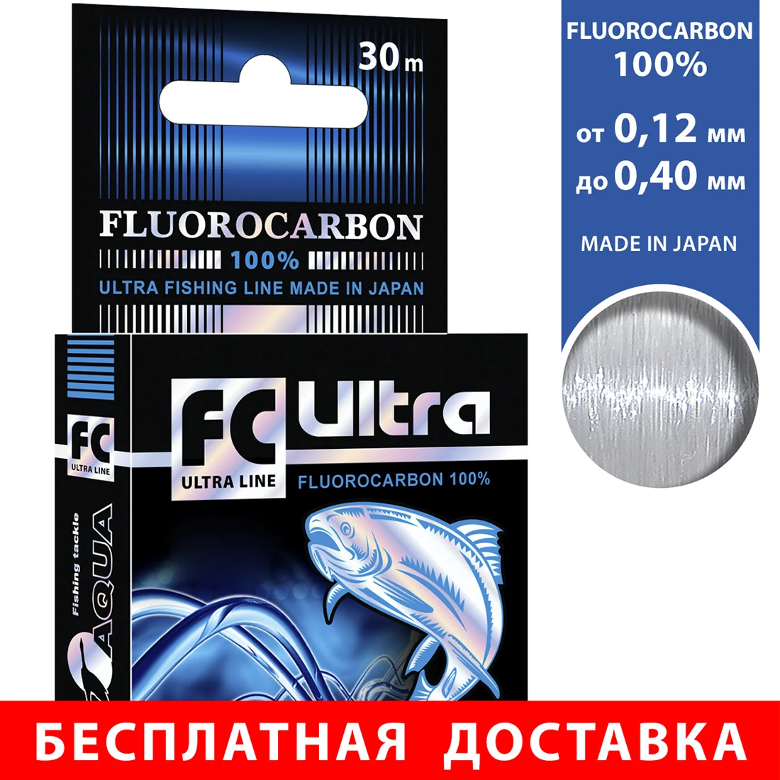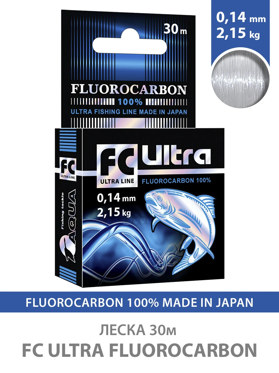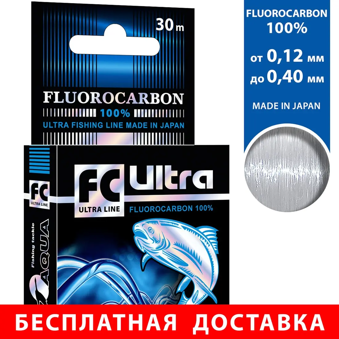 Леска рыболовная AQUA FC Ultra Fluorocarbon 100% (Флюорокарбон 100% ) 30m, от 0,12 до 0,40mm, тонущая, Бесплатная доставка по РФ