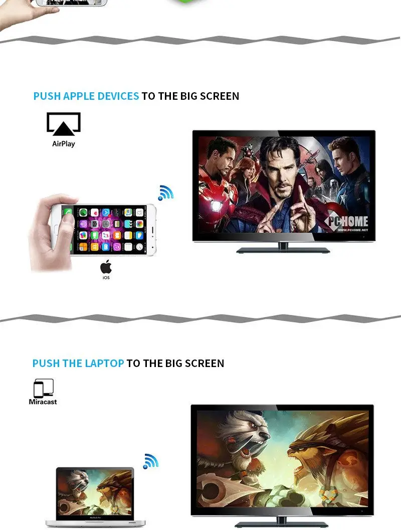 【Особенности продукта 】 Синхронизируйте экраны мобильных телефонов, планшетов и ноутбуков для отображения устройств с HDMI, такими как телевизоры, проекторы, экраны автомобилей и т. д., применимые к операционным системам, таким как IOS, Android, Mac, И окон. 【Преимущества продукта 】 . Низкое энергопотребление чип, низкое тепловыделение . Встроенный 802.11a/b/g/n 300 Мбит/с 2,4 ГГц Высокая скорость wi-fi и высокая чувствительность направленная антенны . Поддержка DLNA, Airplay, Miracast, Airplay mirror и других протоколов подключения . Маленький экран (мобильный телефон)-это мощный инструмент для большого экрана (ТВ-экран) . Мобильный телефон не занимает заряженные данные при нажатии на носитель, мобильный телефон становится пультом дистанционного управления . Поддерживает многожильное считывание, не влияет на другие функции телефона при нажатии на носитель . Поддержка нескольких людей и нескольких мобильных телефонов для одновременного подключения, поделиться своим волнением вместе . Жесткое декодирование, поддержка плавного воспроизведения видео и фотографий, сделанных всеми смартфонами . Совместим с несколькими протоколами форматов потокового мультимедиа, бесплатно пользоваться обширными видео-ресурсами Интернета . Поддержка 720/1080P HD выход, наслаждайтесь идеальным качеством изображения . Поддержка WPS шифрования одним ключом, быстрое подключение к маршрутизатору или конфигурации AP . Модный и изысканный дизайн, это хороший компаньон для путешествий на дому. 1. Новый процессор A210C ARM 2. Поддержка декодирования H.265, сохранение полосы пропускания, делает тот же экран более гладким 3. Нет программы переключения для работы с Apple Android! 4. Сосуществования трех каналов: Поддержка прямого подключения, маршрутизации и режима P2P 5. Поддержка онлайн-обновления, пользователям не нужно устанавливать, автоматическое обновление поддерживает s iOS