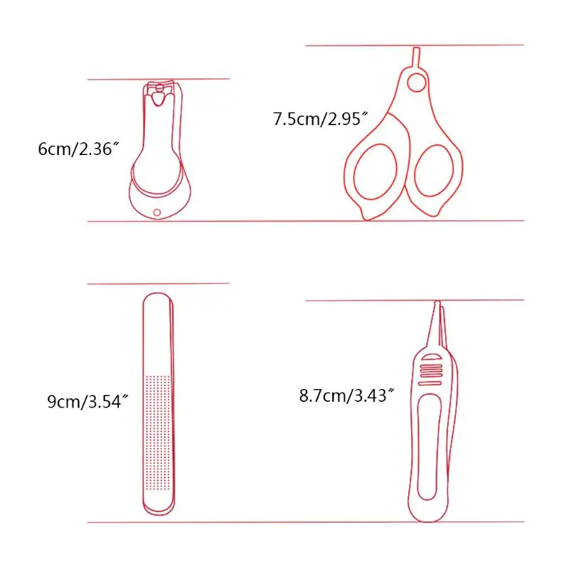 Размер: прибл. Ножницы для ногтей: 60 мм/2,36 дюйма, пинцет: 87 мм/3,43 дюйма, матовая пилка для ногтей: 90 мм/3,54 дюйма, ножницы: 75 мм/2,95 дюйма