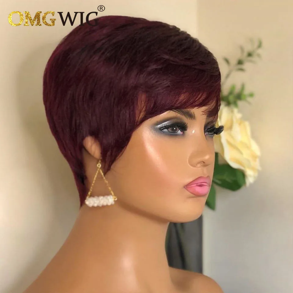 Бордовый 99J Цвет Короткие Волнистые Короткие Боб Пикси стрижка тупой не шнуровка фронта человеческих волос с челкой для чернокожих женщин бразильский