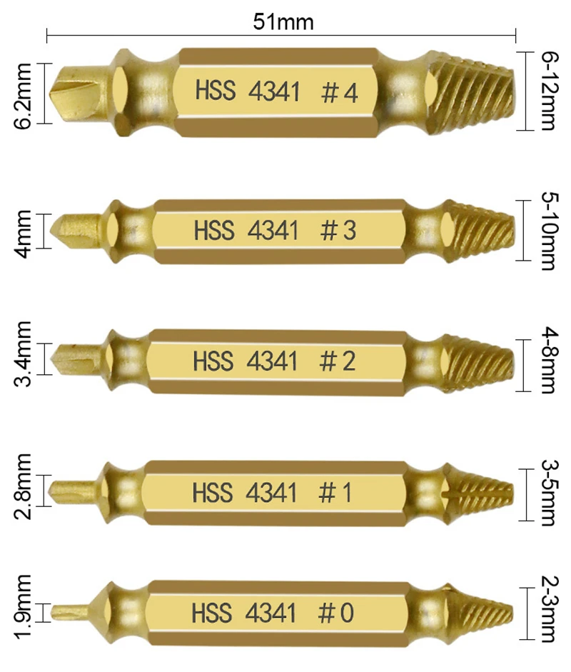 Описание:5 шт. HSS с титановым покрытием двойная головка поврежденный болт экстрактор сверла сломанный болт шпилька в полоску винтовые съемникиСпецификация: