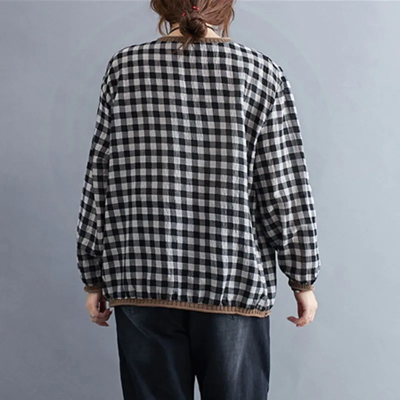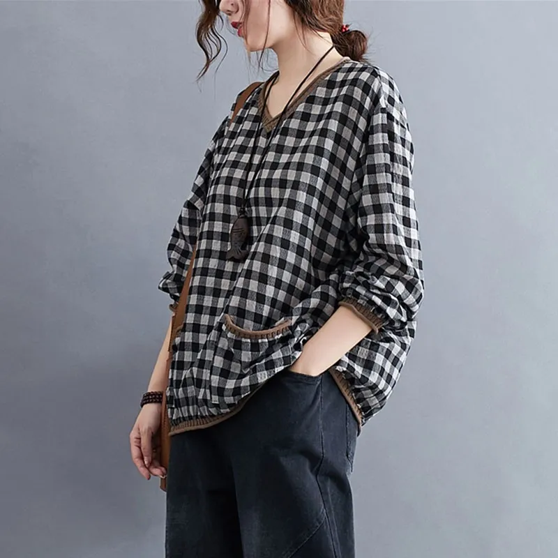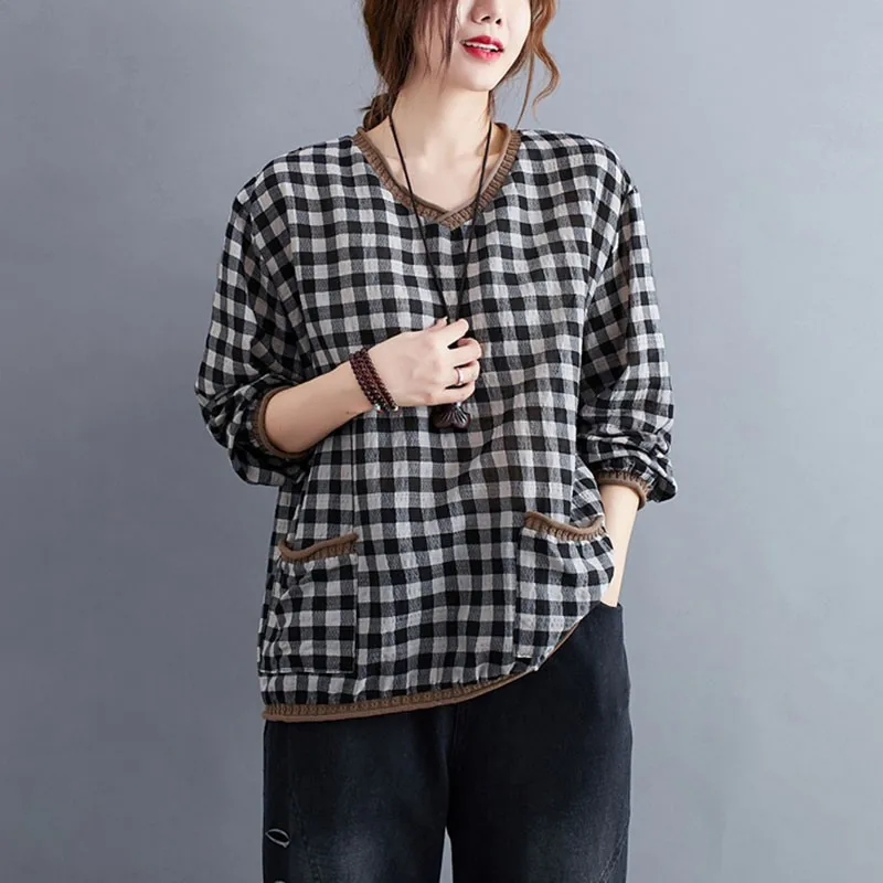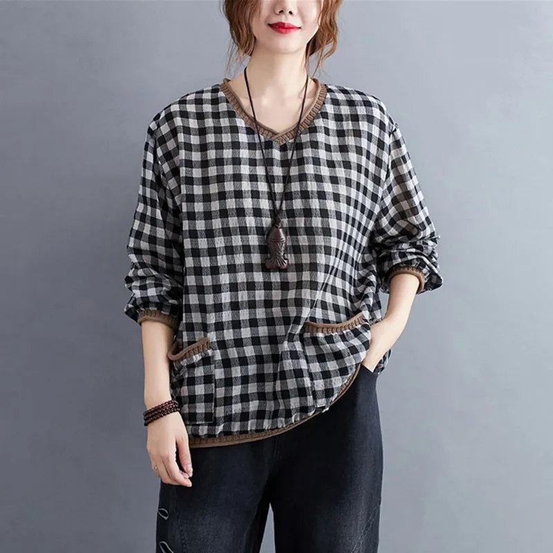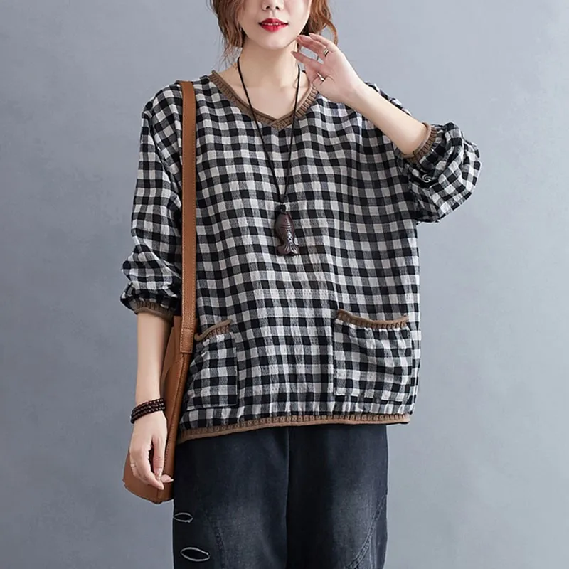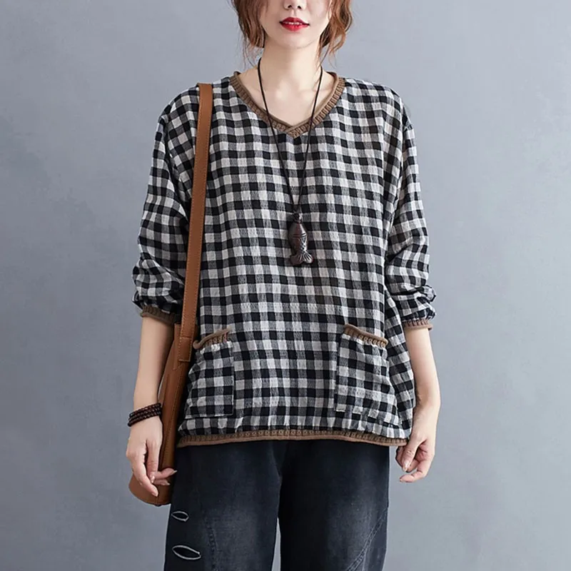 Блузка женская из хлопка и льна, с V-образным вырезом и длинным рукавом, осень 2020