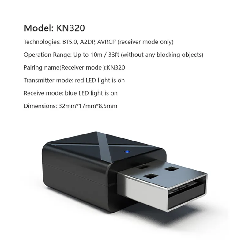 A) режим RX: имя сопряжения: KN320, найдите KN320 в настройках Bluetooth телефона для сопряжения. Синий светильник мигает во время процесса сопряжения, и синий светильник перестает мигать после успешного сопряжения. Подключите устройство к аудиоустройству с 3,5 аудио кабель.