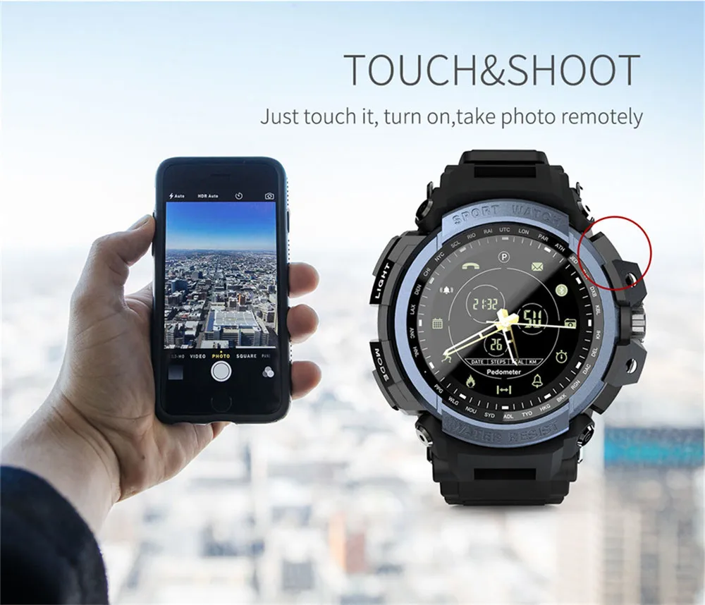 Смартфон, подключенный к приложению через Bluetooth 4,0. Стабильное, быстрое и супер низкое потреблениеШагомер: Установите цель своего здоровья и просматривайте свою повседневную деятельность, проверяйте и анализируйте данные в любое времяУдаленная камера в пределах 10 мНапоминание: телефонные звонки, сообщения, Twitter Facebook, WhatsApp, SkypeПростое и понятное функциональное меню, управление одной кнопкой, простота в использованииЖК-дисплей отображает шаги, расстояние и калории3 группы звукового будильника, вы ничего не пропуститеПрофессиональный секундомер поддерживает отображение времени и фонаIP68 (или 5ATM) Стандартная защита от пыли и водыНе нужно заряжать.Срок службы батареи: (энергосбережение) 12 месяцев.Срок службы батареи: (нормальный) 8 moths.Гарантия: 1 год.Языки приложения: английский, русский, французский, итальянский, немецкий, испанский, португальский, японский и арабский. Примечание:1) не нажимайте кнопки под водой.2) Не снимайте заднюю крышку самостоятельно. (Задняя крышка требует профессионального оборудования для демонтажа и установки.)