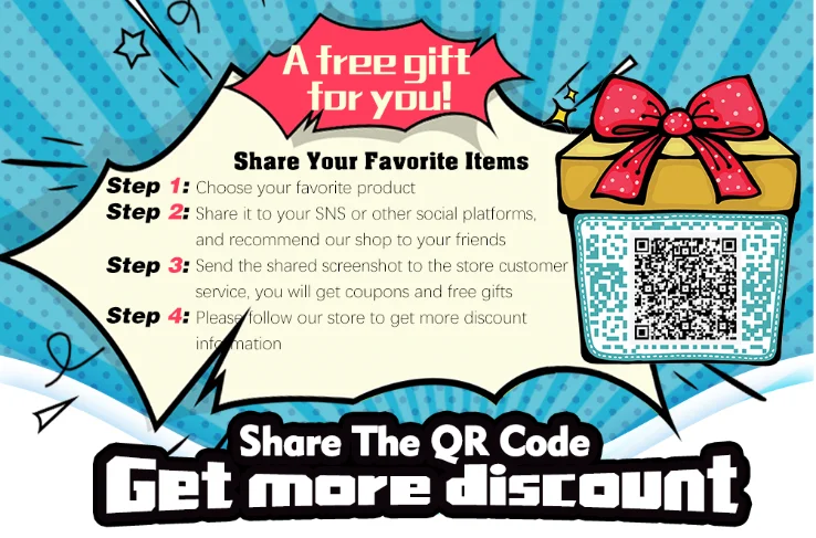 Поделитесь своими любимыми товарамиШаг 1: выберите ваш любимый продуктШаг 2: Поделитесь им с вашими SNS или другими социальных платформами и Порекомендуйте наш магазин своим друзьямШаг 3: Отправьте общий скриншот в службу поддержки клиентов магазина, вы получите $10 купон и бесплатные подаркиШаг 4: Пожалуйста, следуйте нашему магазину, чтобы получить больше информации о скидках