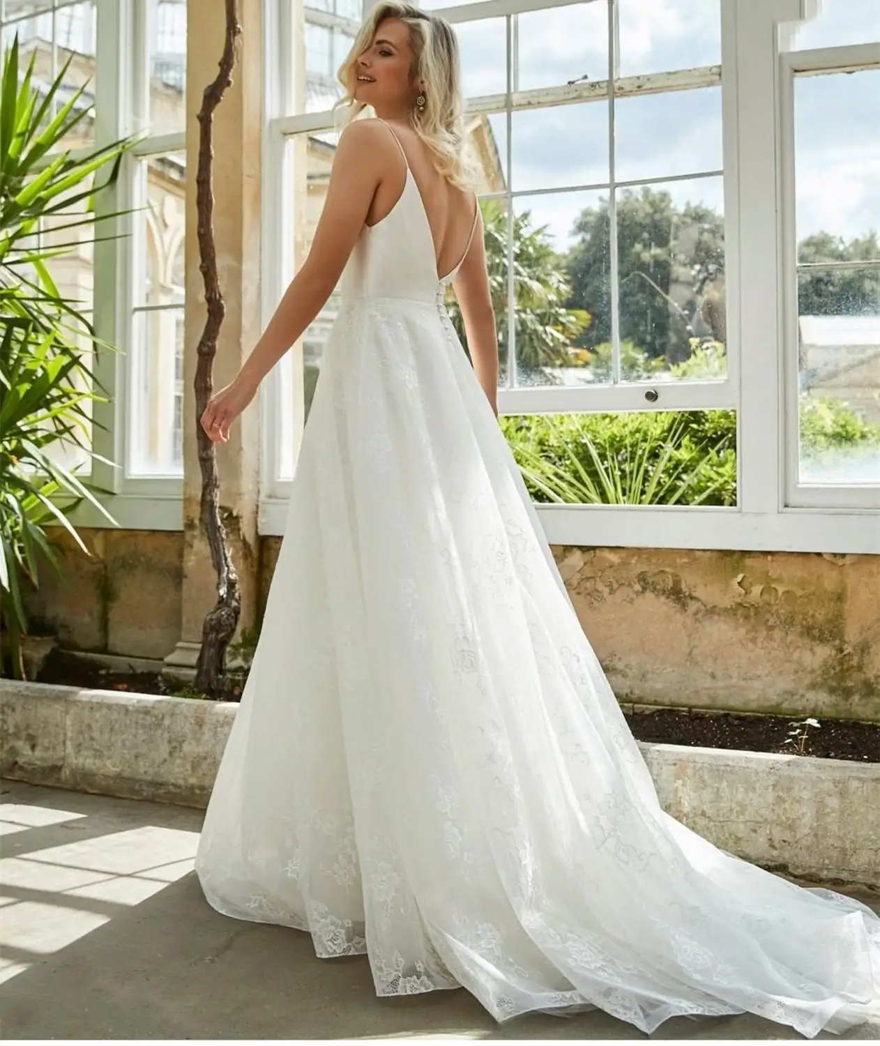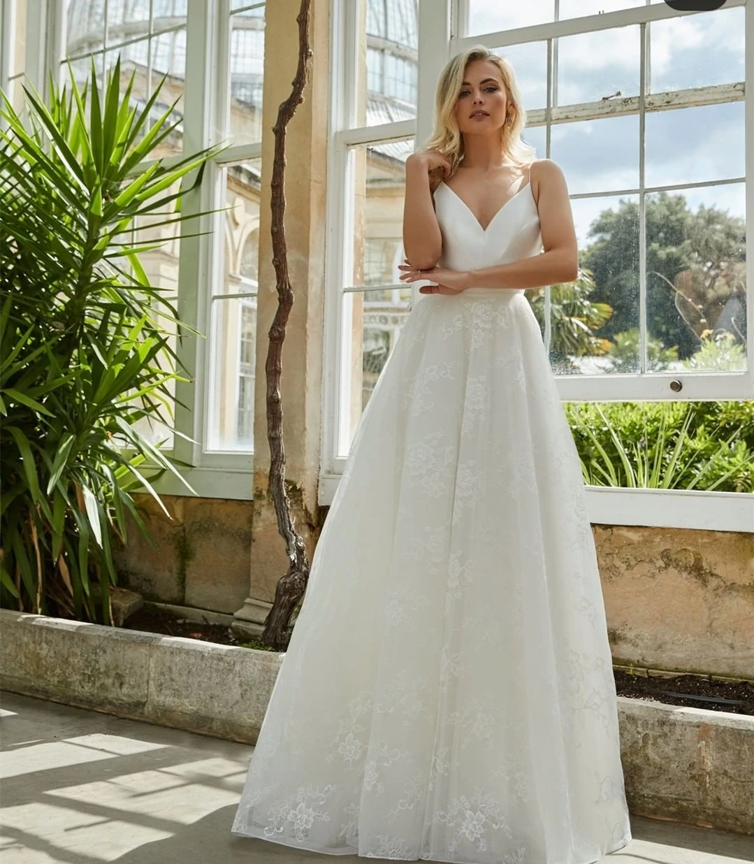 Свадебное платье в пол, из органзы, с V-образным вырезом