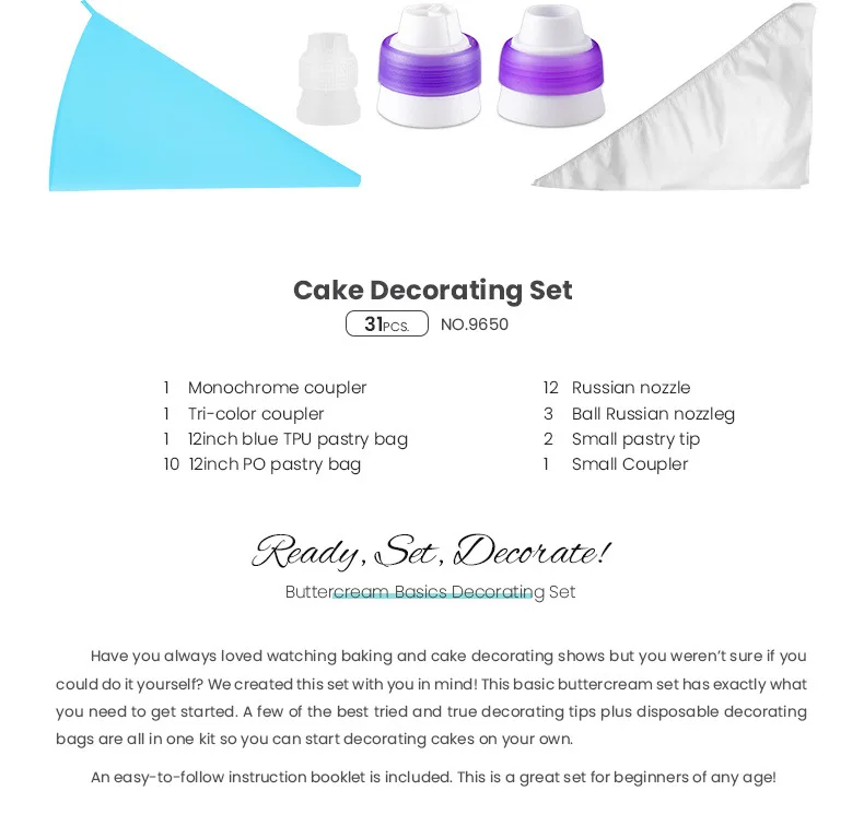 Посылка включает: 1 Набор инструментов для торта (12 насадок для глазури + 1 зеленый муфта для цветочных насадок + 1 силиконовый пакет + 2 насадки в виде листьев + 1 маленький конвертер для насадки в виде листьев + 3 шариковых насадки + 1 фиолетовый муфта для шаровых сопел + 10 шт одноразовый мешок)