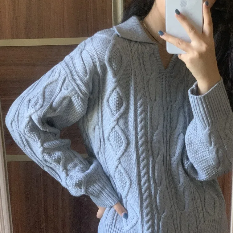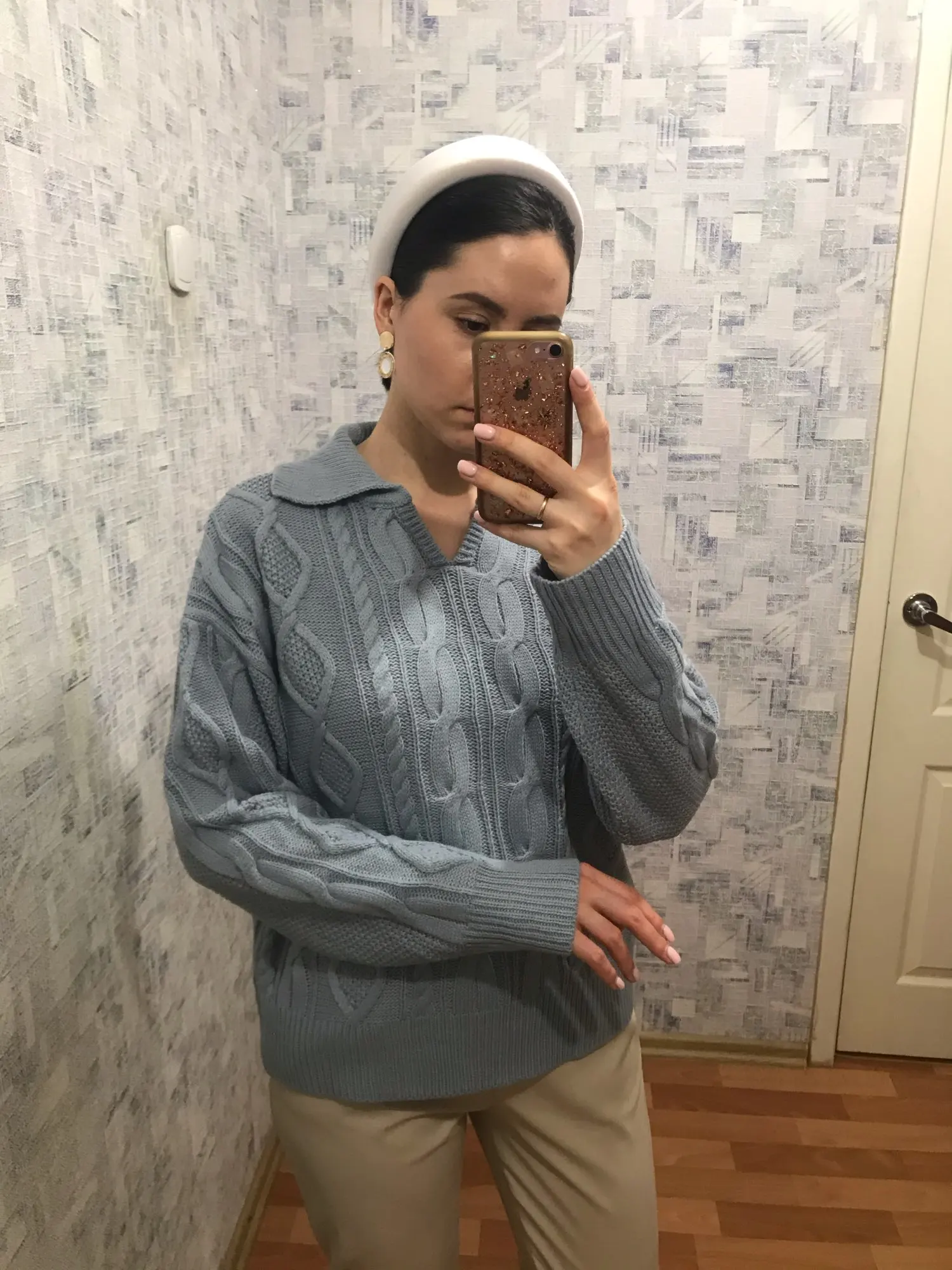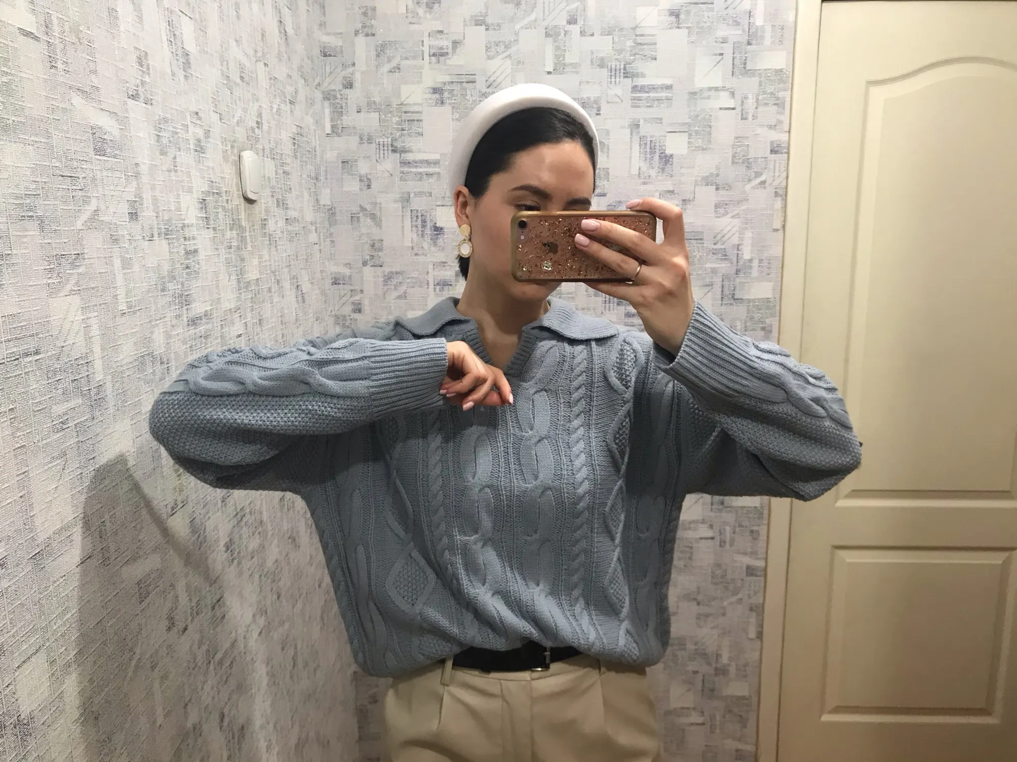 Свитер красивый. Заказала голубой,. Цвет серо-голубой. Обычно ношу размер М, подошел очень хорошо! Рукава длинные - это супер. У меня рост 170, и он хорошо подошел по всем длинам!