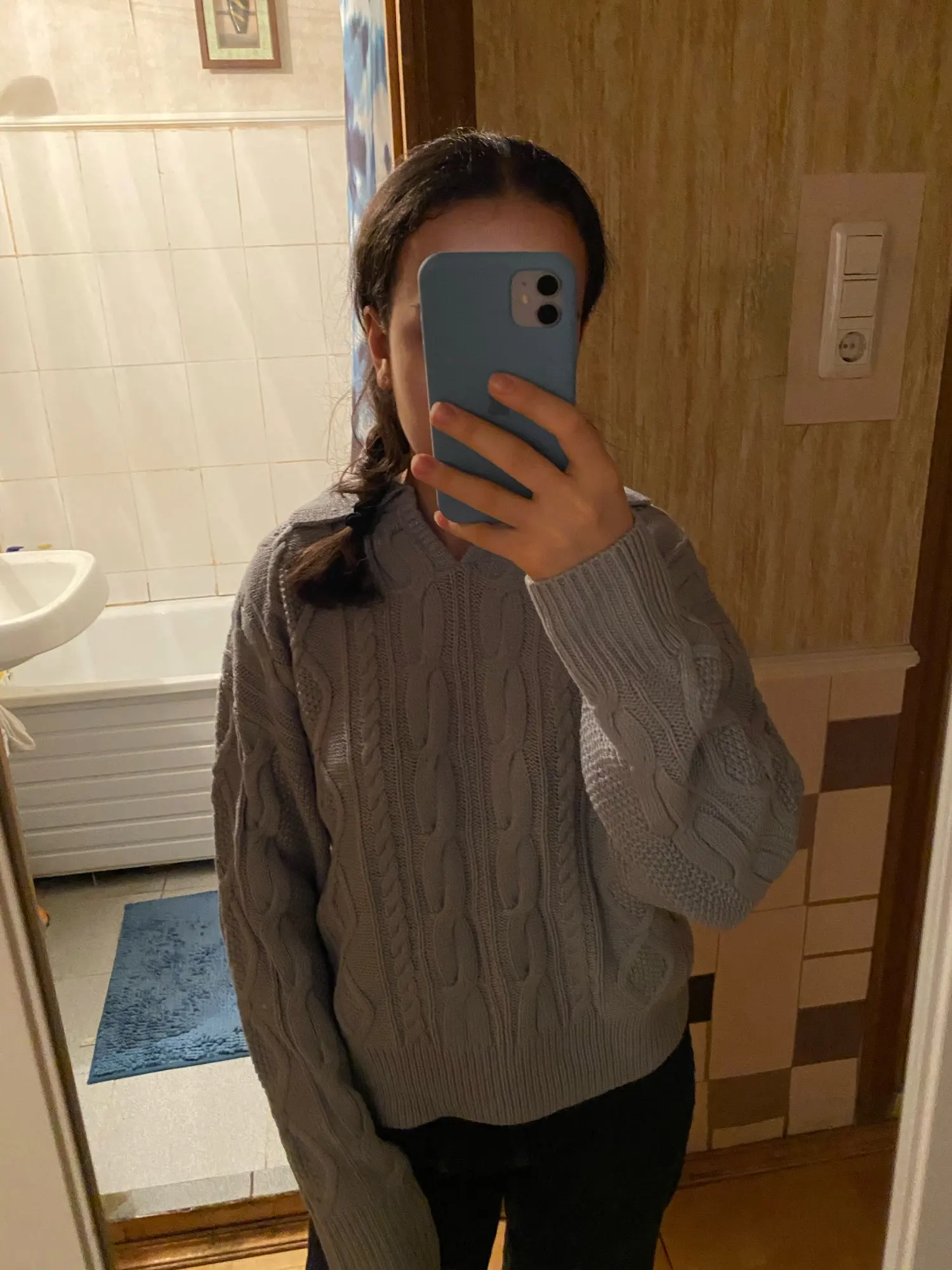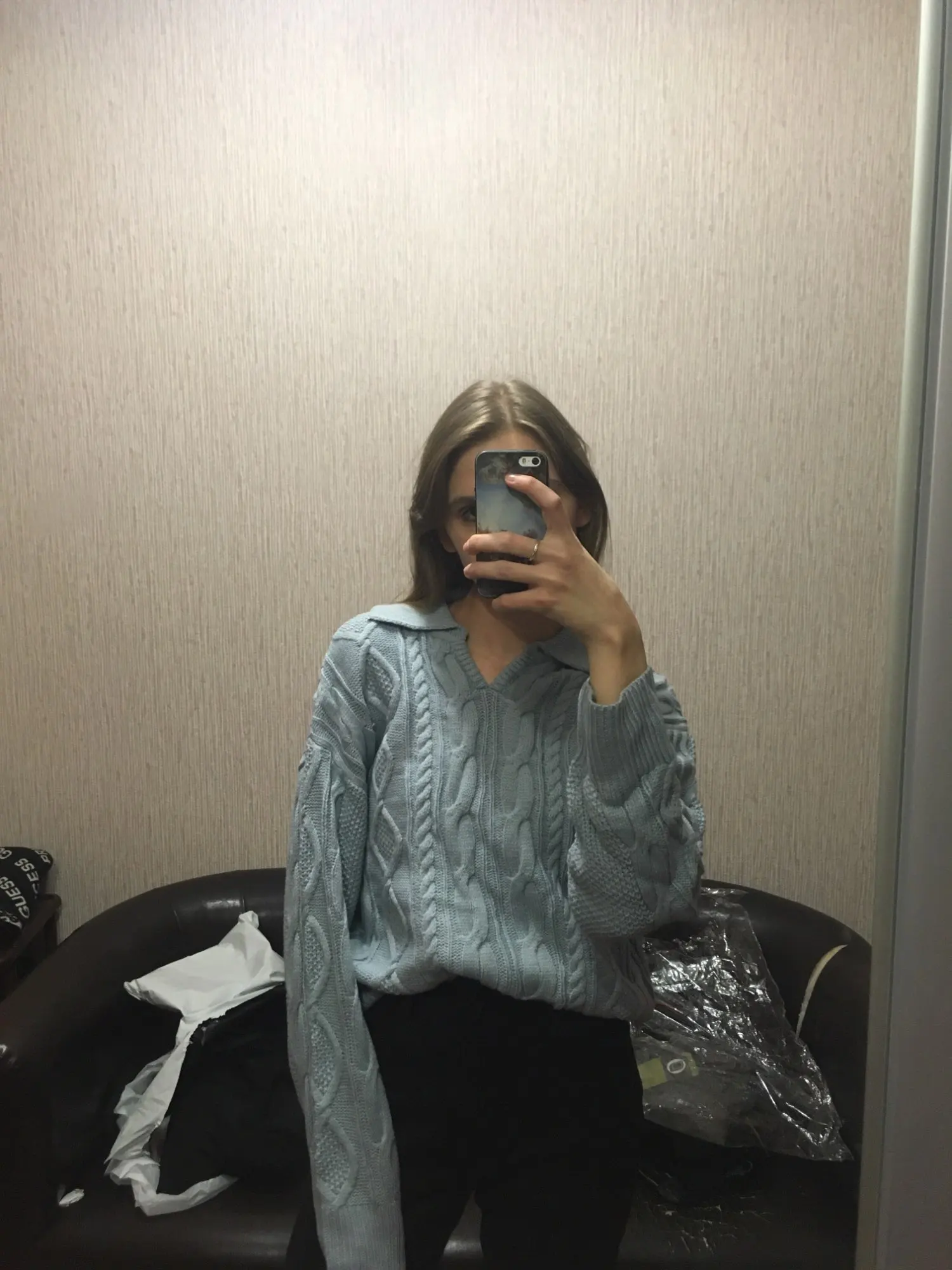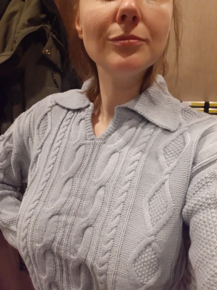 Свитер потрясающий! Сидит отлично. Цвет серо-голубой, красиво смотрится. Кое-где торчат нитки, но не критично. Боюсь, катышки будут со временем. Но, главное, в носке удобный и тёплый! И сам фасон мне очень нравится.
