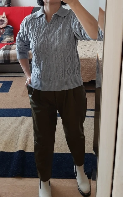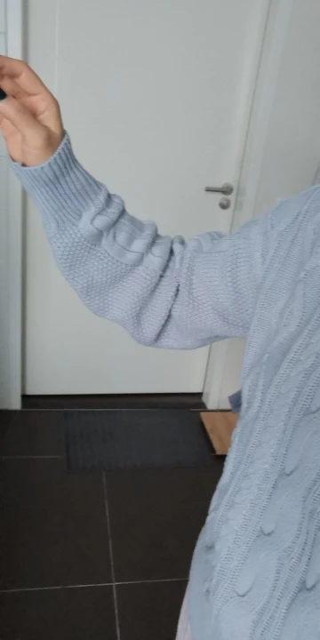 Свитер очень понравился - цвет нежный серо-голубой, приятный к телу. Длина изделия на рост 160см не доходит до середины бёдра, удобно заправить в высокие джинсы/брюки. Судя по длине рукавов подойдёт на рост до 170см. Мне на 46 российский размер подошёл отлично, сидит свободно, однозначно рекомендую.