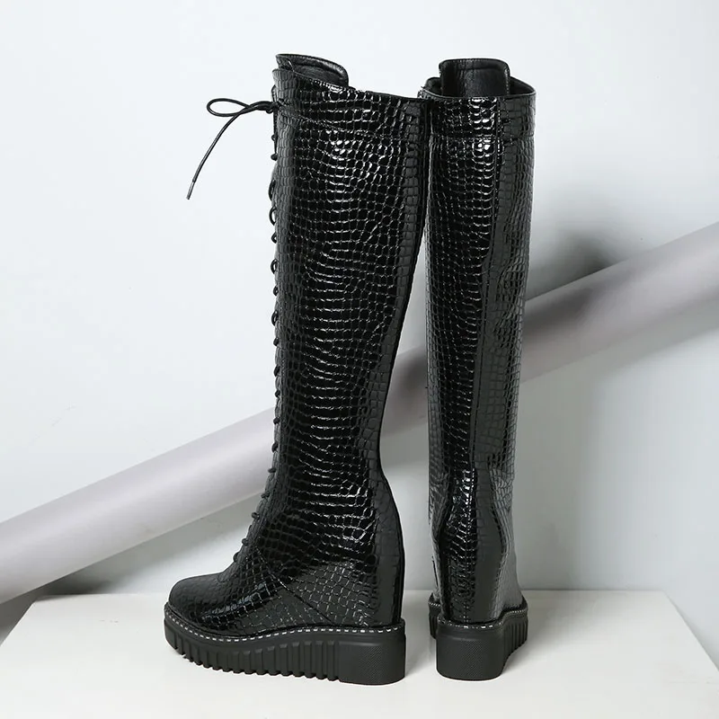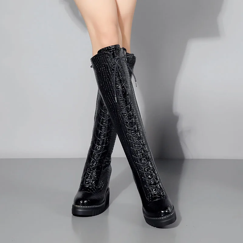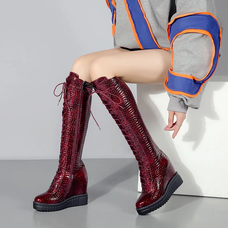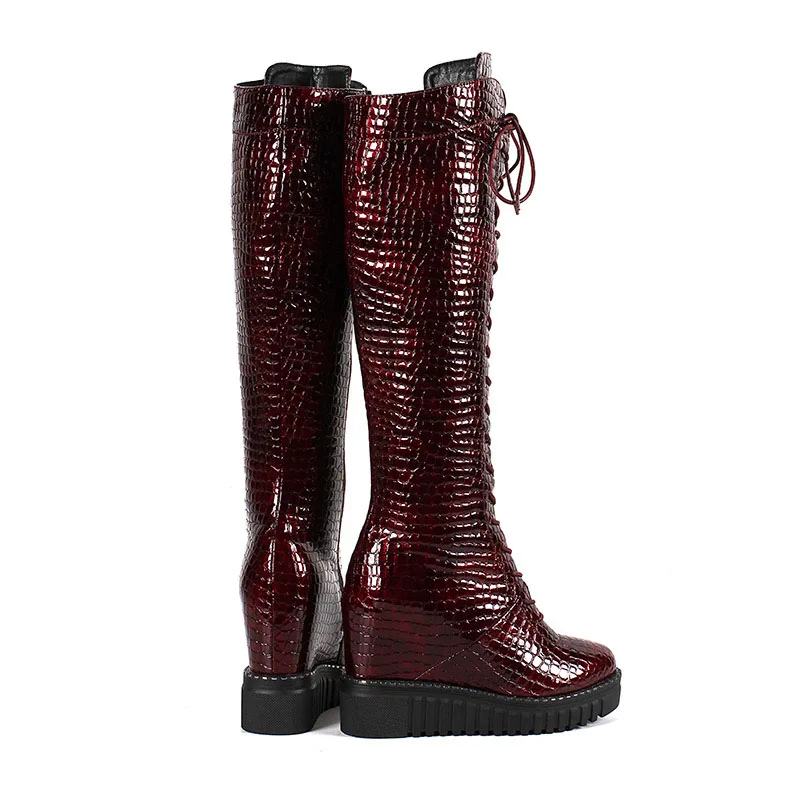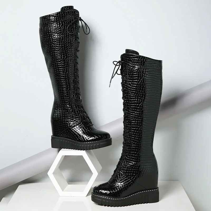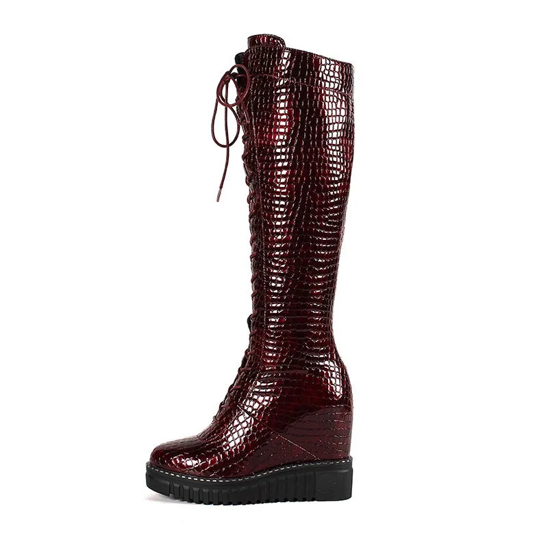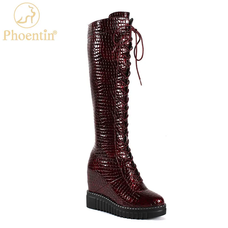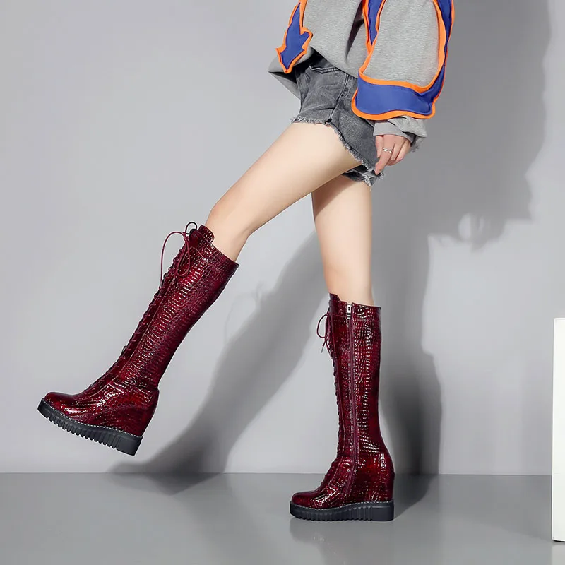 Сапоги женские из натуральной кожи, на высокой танкетке, с перекрестной шнуровкой, FT1207, зимние, 2020