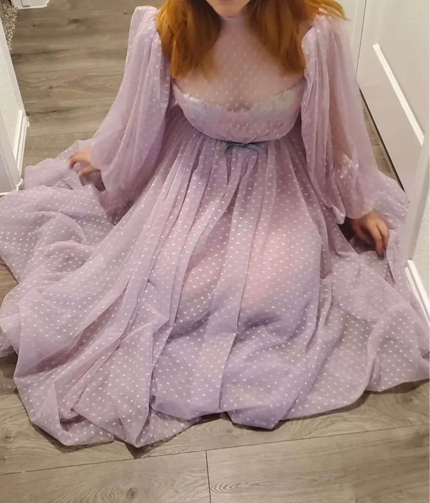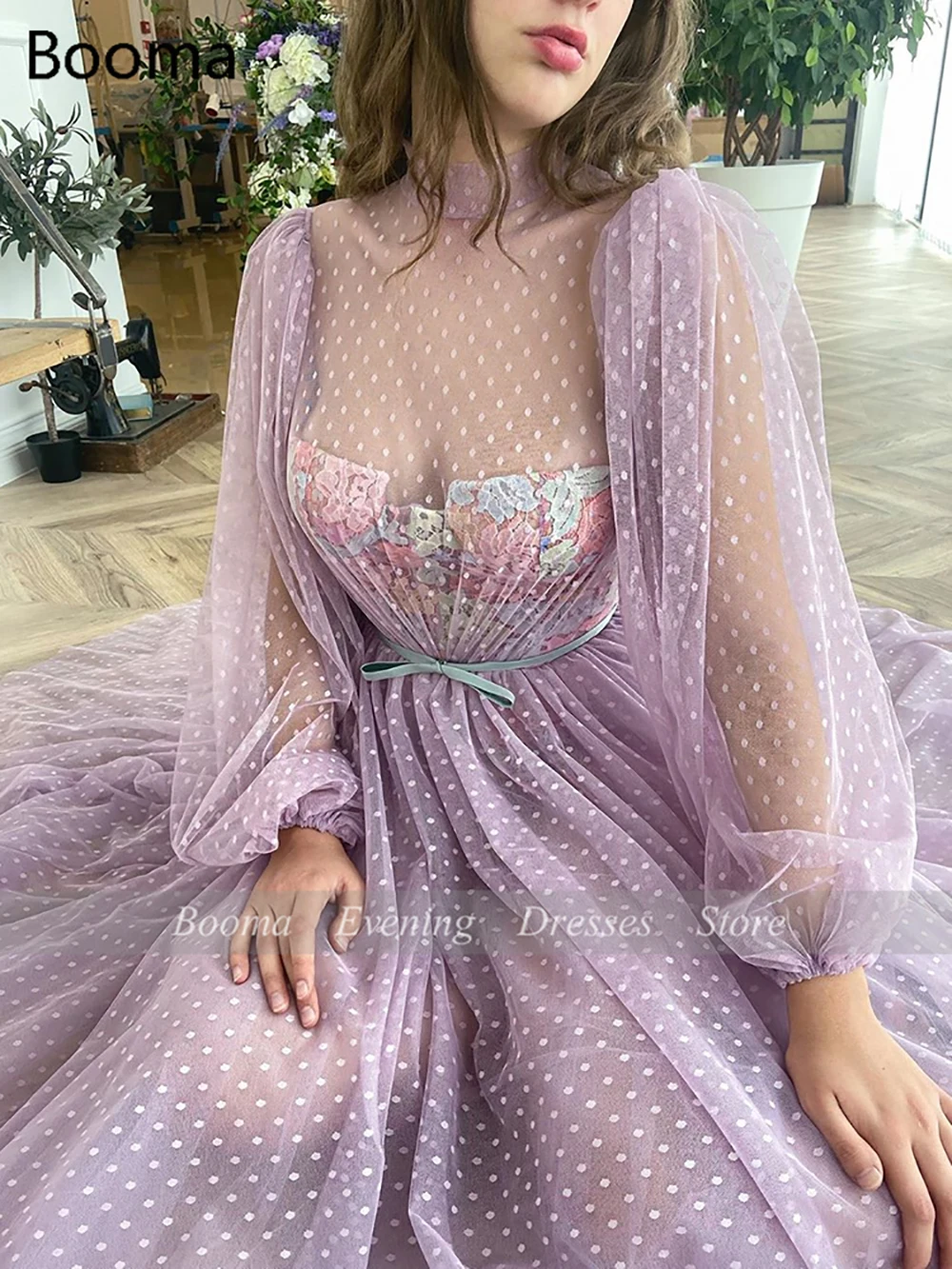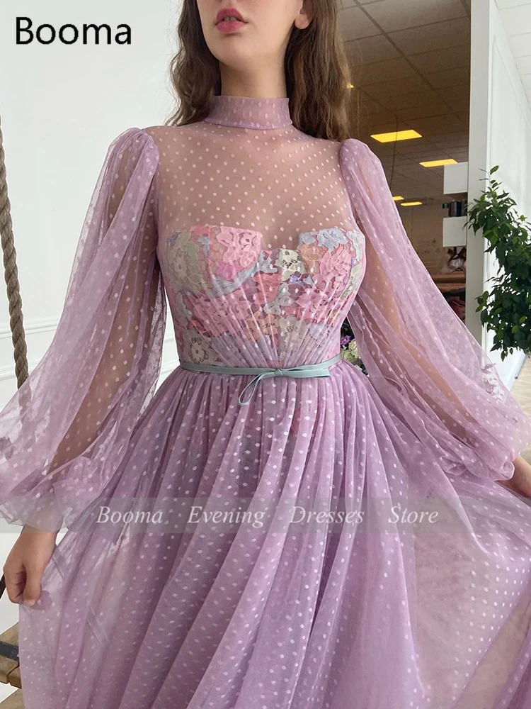Лавандовое платье для выпускного вечера, с высоким воротом, с длинным рукавом, в горошек, Тюлевое, до середины икры, с разноцветными аппликациями