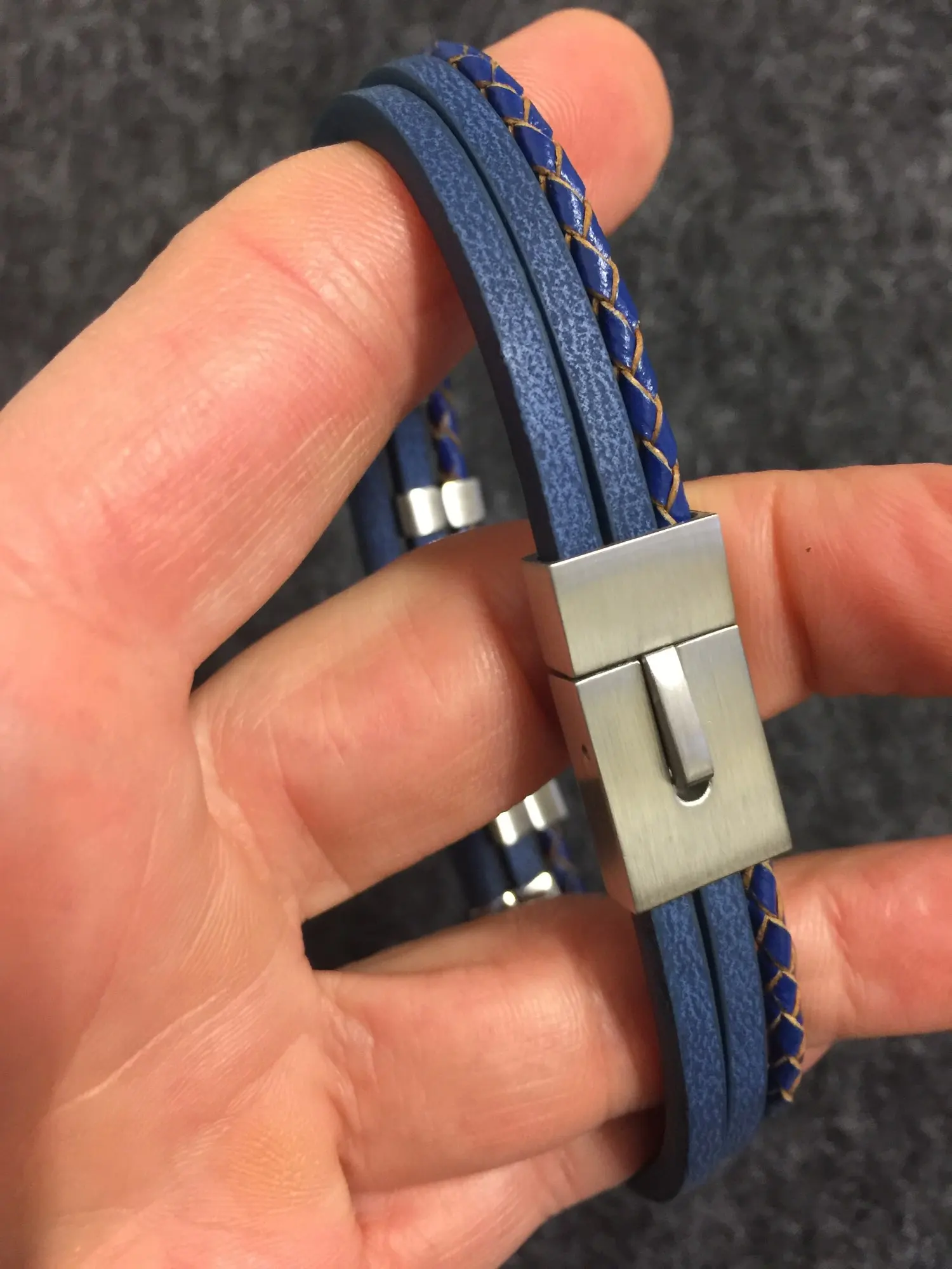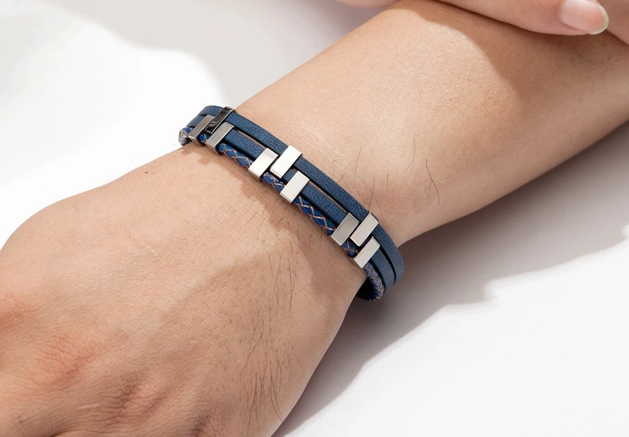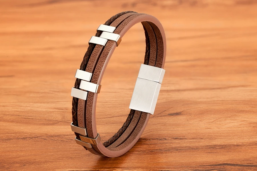 Браслет мужской кожаный, трехслойный, из нержавеющей стали