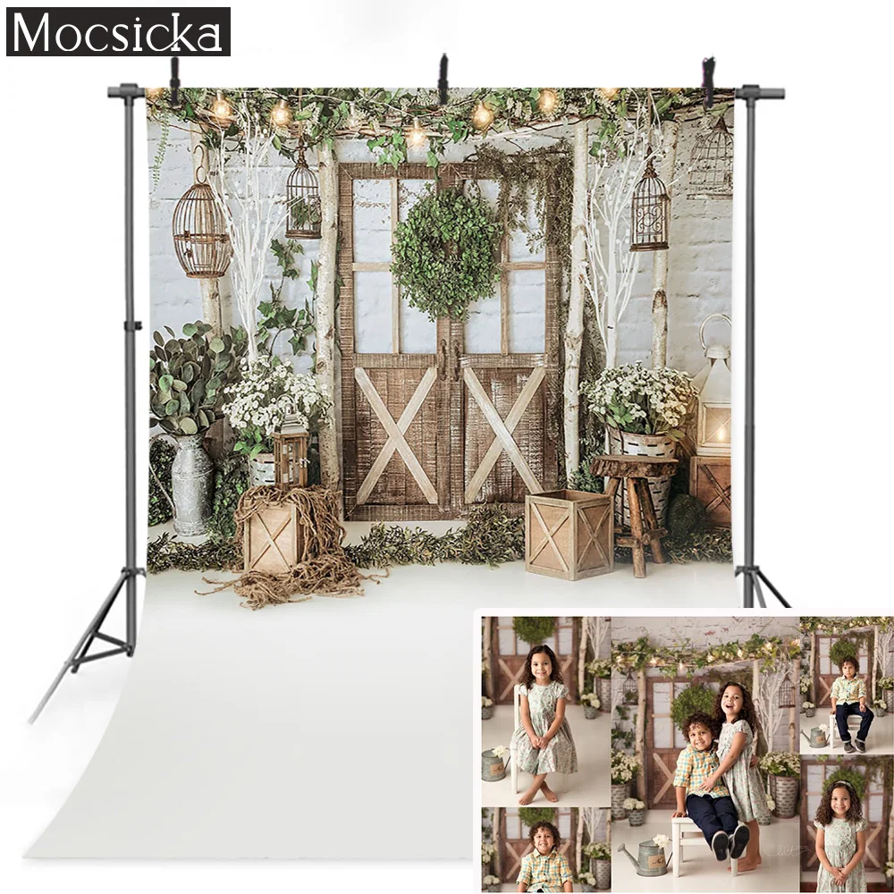 Рождественский детский день рождения портрет фотографии фоны Ретро деревянная дверь зеленые листья зима фото фон фотосессия