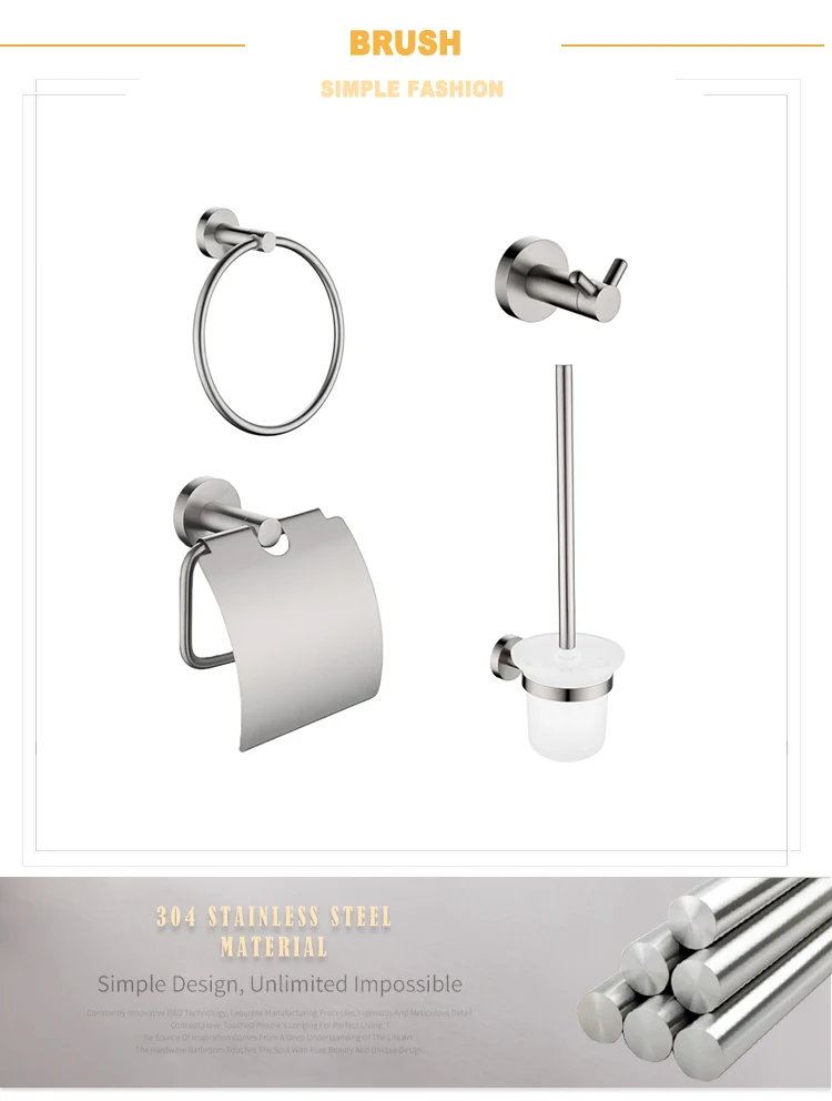 Особенности и характеристики:Набор оборудования для ванной комнатыКрючок для халата + бумажный держатель + держатель для туалетной щетки + кольцо для полотенец/вешалкаМатериал: нержавеющая сталь SUS 304Использование: ванная комната/душевая комната/туалетЦвет: матовыйТип: аксессуары для ванной комнатыУстановка: НастенныйВключая все монтажные фитинги