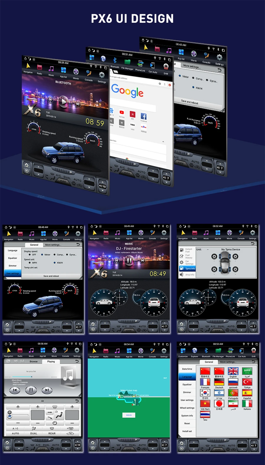 ПараметрыСистемыЧипсетRockchip PX6Операционная системаAndroid 9,0ПроцессорCotex A72, 1,8 ГГцОперативная память4 ГБВстроенная память32/64 ГБДисплейЭкран IPSУправлениеЕмкостный сенсорный экранНавигацияХранилище картВстроенная вспышкаКартыIGO, Google ,Sygic онлайн картаПрименениеBluetoothBluetooth 5,0Bluetooth hands-free, телефонная книга и поиск, A2BC bluetooth музыкаDSPПоддержка в корпусе с двурядным расположением выходов и 16 Эквалайзер Звук УправлениеРадиомодульNXP6686, RDSАвтомобильный автоПоддержка Apple Carplpay и Android Auto.Зеркальное соединениеПоддержка IOS, Android phone linkМедиаЯзыкиАнглийский, китайский, немецкий, французский, испанский,Итальянский, русский, турецкий, тайский и т. Д.АудиоMP3,WMA,APE,FLAC,AAC и т. Д.ВидеоMP4,AVI,MOV,RMVB,FLV и т. Д.ИзображениеJPG,JPEG,BMP,GIF,PNG и т. Д.Текст.TXT,Office,PDFСетьРежим связиВстроенный WIFI/мобильный телефон hot spotОригинальная Автомобильная поддержкаКондиционер воздухаПоддержка оригинального контроля кондиционера автомобиля,Двойной режим A/CSWCПоддержка управления рулевого колеса автомобиляUSBСовместимость с оригинальными USB интерфейсамиКамераПоддержка оригинальных автомобильных камер и оригинальные 360 панорамные камерыВидеорегистраторПоддерживает дополнительный видеорегистратор и встроенную функциюРадар заднего ходаПоддержка оригинального радара заднего хода автомобиля и отображения информации о радареБДОтображение информации OBD: скорость, скорость транспортного средства, расход топлива, информация о двери автомобиля и т. д.РасширениеUSBСтандартные два usb-интерфейсаAUXПоддержка внешнего видео и аудио входаВид спереди и справаПоддержка переднего и правого просмотра видео сигналаAHD входПоддержка AHD /CVBS входного сигналаВидеовыходПоддержка HDMI /AV видеовыходаТаблица Сравнения разрешения экрана(Стандарт производителя по умолчанию)Размер экранаРазрешение экранаУправление экраном10,4 дюймов1024*768 /1280*800Емкостный сенсорный экран IPS12,1 дюймов1024*768 /1280*80011,8 дюймов1920*1080 /1280*48013,6 дюйма1920*1080 /1280*48016 дюймов1920*1080 /1280*48013 дюймов1600*12009,7 дюймов768*1084