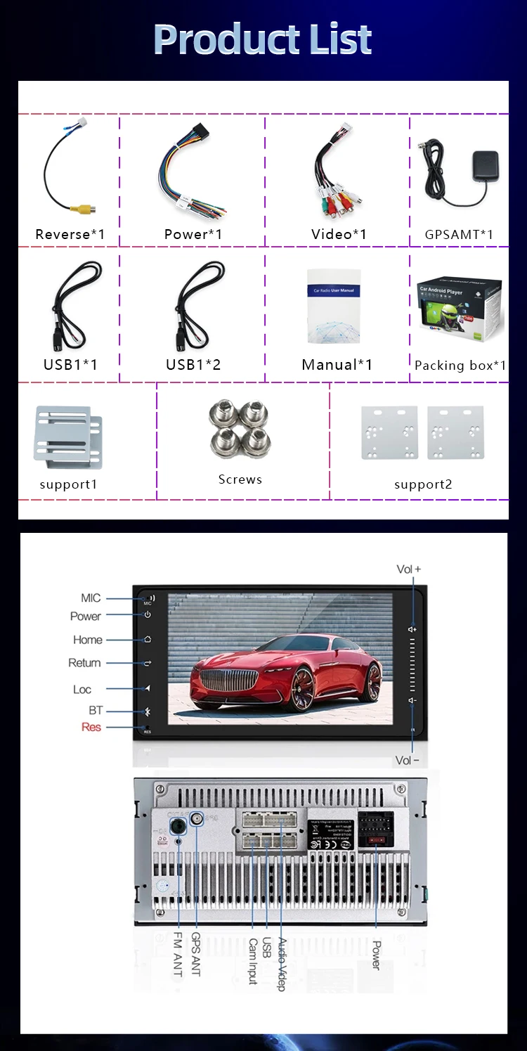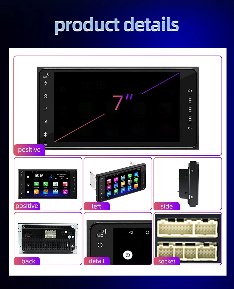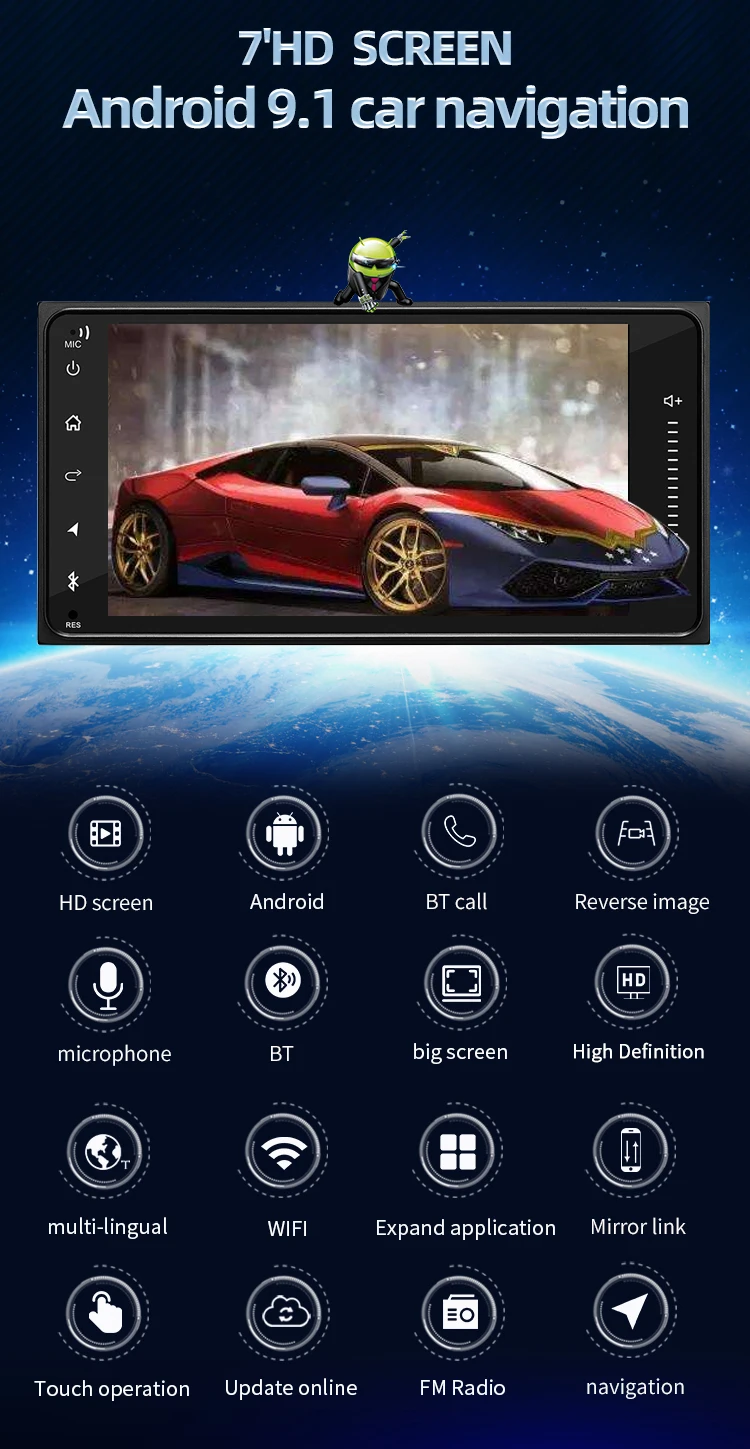 Напряжение: 12 В постоянного токаЦП: A7 1.3GHZx4Операционная система: Android 9,1RAM: 1G/2GПЗУ: 16 Гб/32 ГБРазмер экрана: 7-дюймовый емкостный экран 2,5DВерсия Bluetooth: 4,0Внутренний: Wi-FiGPS: поддержкаРадиодиапазон: FMРазрешение: 1080PАудиоформат: MP3 MP2 AAC OGG FLAC APE WMA WAV RM AC3Формат видео: AVI 3GP/MP4 MOV MPG MKV WMV RMVBЯзык: китайский, английский, тайваньский, арабский, бразильский, русский, иврит, испанский, итальянский, французский, тайский, немецкий, японский, корейский, турецкий, чешский, иранский, венгерский, голландский, польский, шведский, украинский, вьетнамский, румынский, греческий, датский, финский и т. Д.Особенности1. Подключение к Wi-Fi: Встроенный Wi-Fi модуль, может подключаться к Интернету через Wi-Fi hot spot, загрузить приложение для просмотра онлайн-ТВ, фильмов, общения с друзьями2.GPS-навигация: Встроенный навигационный модуль, Бесплатная навигационная карта (включая большинство стран), Поддержка многоязычного интерфейса/голосовой навигации3. Функция Bluetooth: Встроенный модуль bluetooth, поддержка подключения к телефону по bluetooth, громкая связь для звонков или воспроизведения музыки по bluetooth4. Функция зеркальной связи: плеер Android MP5 может зеркальная связь с телефоном Android с помощью USB-кабеля (телефонная связь IOS по Wi-Fi), вы можете коснуться экрана MP5, чтобы управлять телефоном AndroidТелефон IOS не может работать с сенсорным экраном MP5 (подходит не для всех телефонов)5. Функция входа DVR: Поддержка USB-входа для внешнего регистратора (DVR) (только для DVR с приложением), вы можете управлять DVR с помощью приложения6. Функция заднего вида: Поддержка входа для камеры заднего вида, более безопасная и удобная подложка автомобиля7. Настройка радио: Поддержка FM-настройки, вы можете слушать радио, которое вас интересует, Наслаждайтесь временем вождения8. Вход для заднего USB-порта: Поддержка заднего USB-входа, может воспроизводить музыку/фильм (U-диск в комплект не входит)Разрешение 9,1020*600: обеспечивает высокое качество визуального восприятия10. Улучшите качество звука с помощью эквалайзера, используйте эквалайзер для настройки звука для достижения лучших результатов11. Поддержка смены логотипа автомобиля12. Поддержка управления рулевым колесом13. Сервис Google-Play Store , Gmail , Google maps и т. д. Поддержка множества карт, которые вы можете скачать в Google shop (cainland, Yandex , IGO и т. Д.)14. Поддержка онлайн и офлайн-карт, I-GO ; Sygic ; Navitel карты, другие страны I-GO или Sygic карты.15. Поддержка цифрового ТВ CMMB (опционально)16. Поддержка USB DVR (опционально)17. Поддержка TMPS (опционально)18. Поддержка OBD (опционально)19. Поддержка DAB (опционально)Посылка1 X Автомобильный сенсорный монитор с Bluetooth1 Антенна GPS1 вход для камеры1 вход/выход RCA1 х Оригинальный автомобильный адаптер2 X USB-кабеля1 X Инструкция по эксплуатации