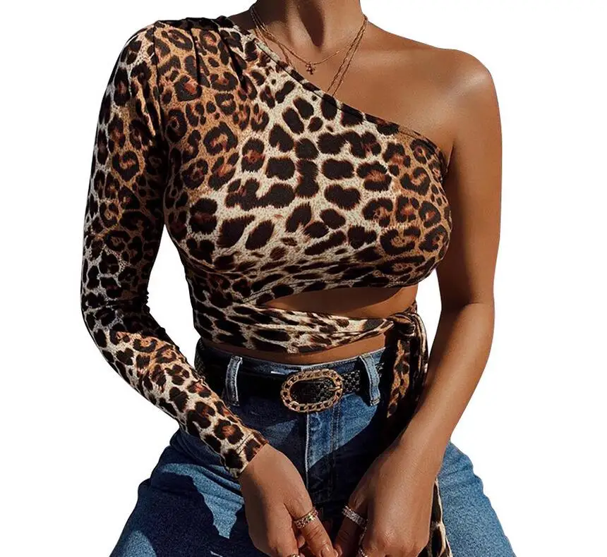 Женские Модные леопардовые топы, тонкие рубашки с длинным рукавом и вырезами на одно плечо