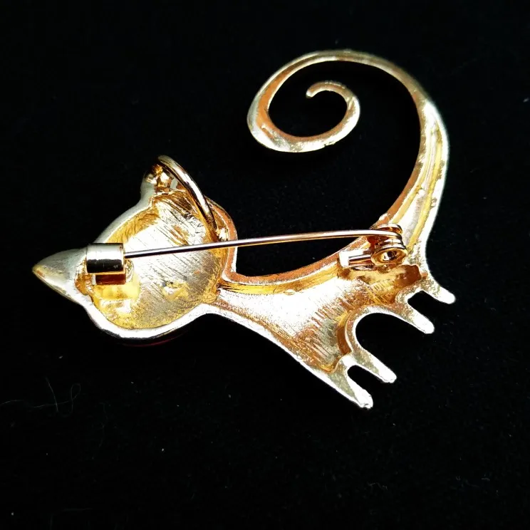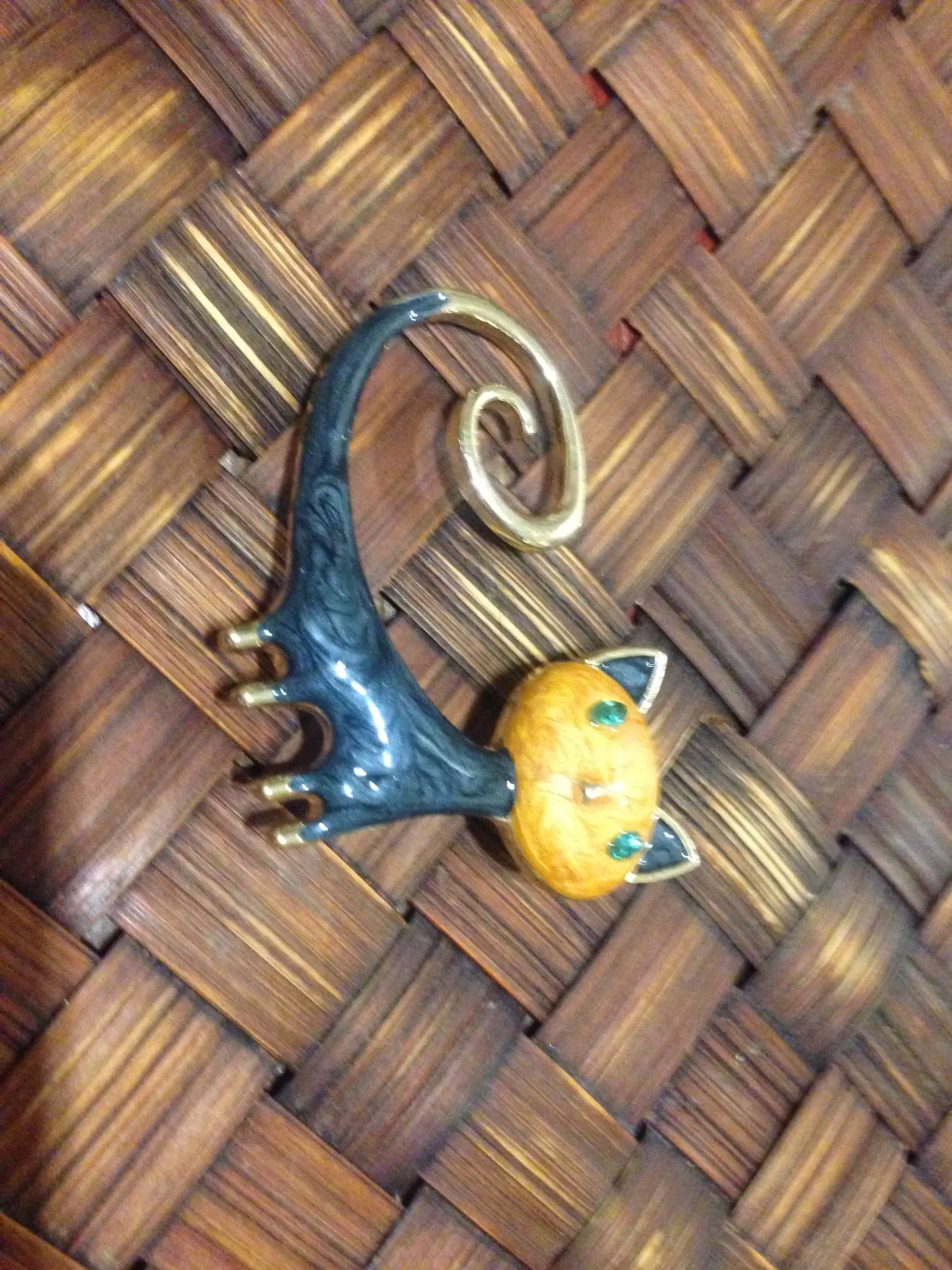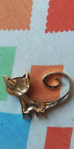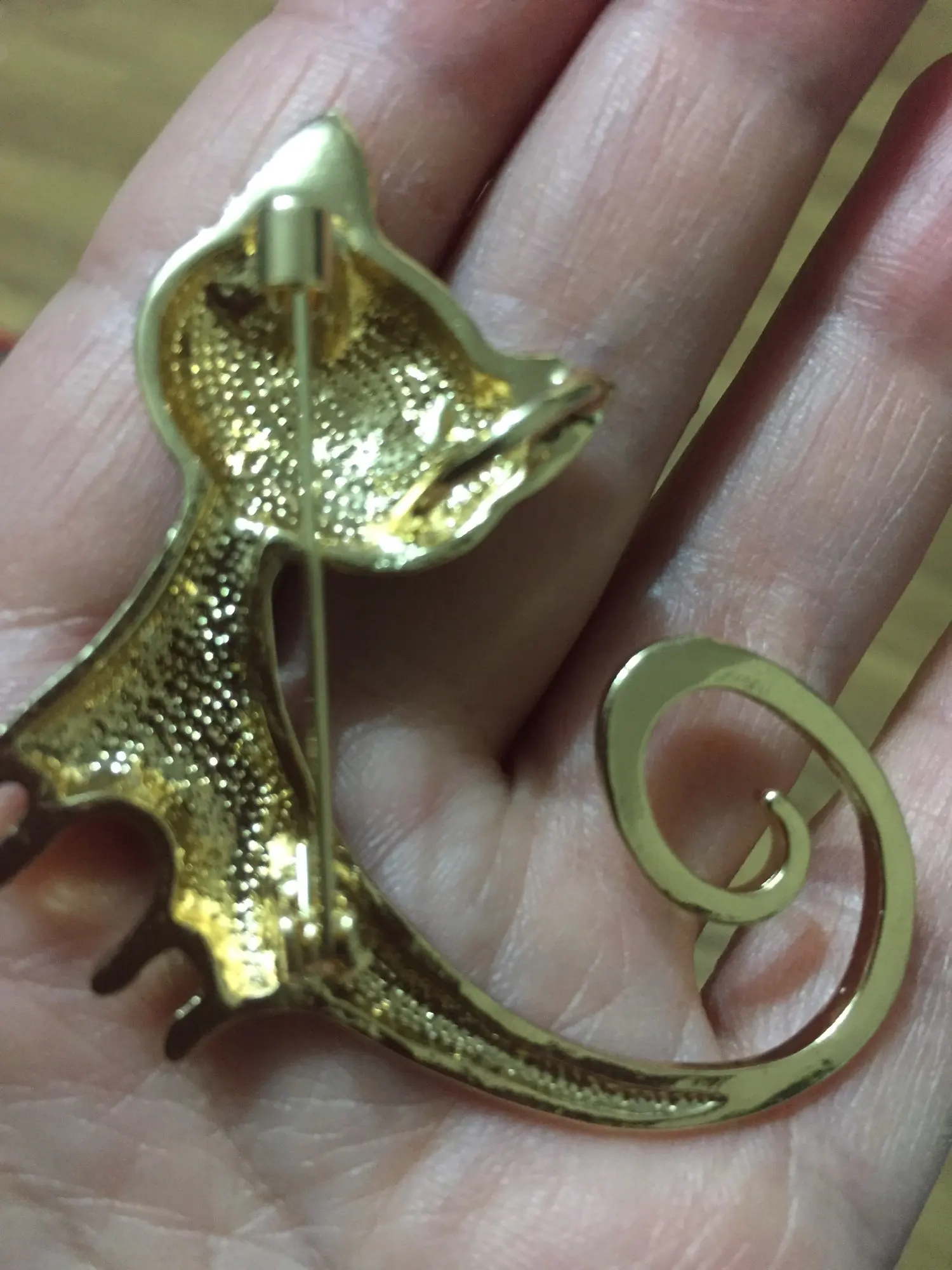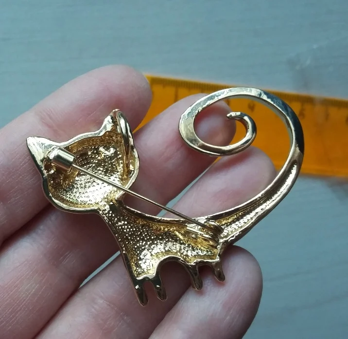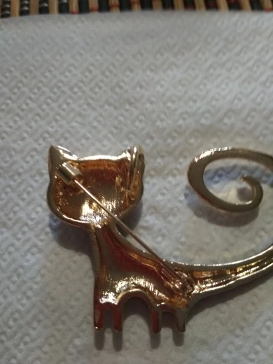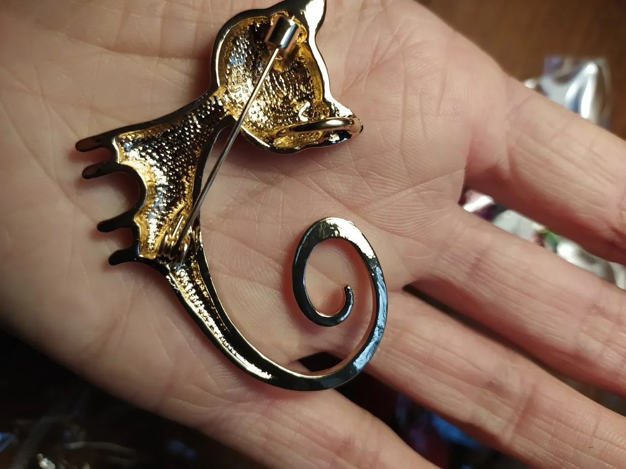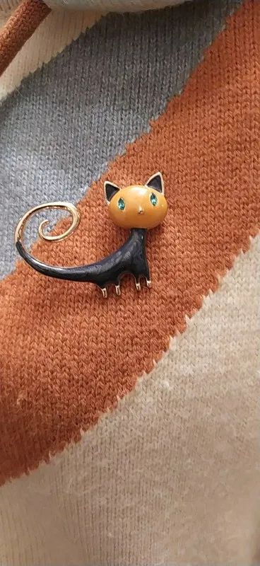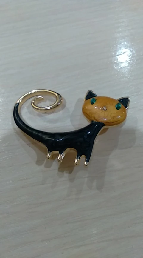 смотрится оригинально, но булавка словно не правильно подсоединена и на одежде хвост перевешивает вниз своим весом и брошь под наклоном получается. Но можно носить как кулон, есть петелька. А так, кот потрясающий!!)))
