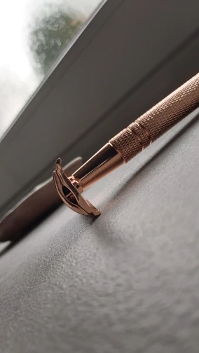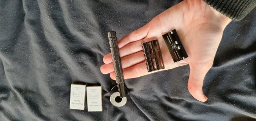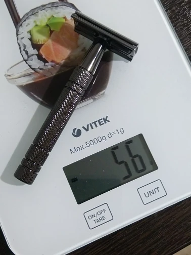 Обычный станок, ничего особенного. Покрытие блестит, из-за этого впечатление дешёвого. Для металлического лёгкий, всего 56 граммов, баланс в сторону головы, ручка почти невесомая, накатка на ней никакая, но не скользил при бритье, из рук не выпал. С лезвием из комплекта побрил вполне прилично, к геометрии головы вопросов нет, если сильно не придираться. Довольно агрессивный, выше, чем 89-я голова, но вот по комфорту.. Скажу так: если вы ничем кроме Рапиры, Лорда и им подобных станков не брились или хотите экономить на бритье и ищете недорогую бритву, то, возможно, вам зайдёт и даже понравится, но если вы знакомы с продукцией Эдвин Джаггер, Разорок, Меркур и т.д, то не тратьте время. Доставка быстрая, 10.11 заказал, 23.11 посылка уже была на почте. Упаковано в бумажный конверт с толстой пупыркой, ничего не повредилось, коробочка целая, в ней кроме бритвы две пачки по пять штук обещанных лезвий без опознавательных знаков и совершенно бесполезная для этого станка щёточка.