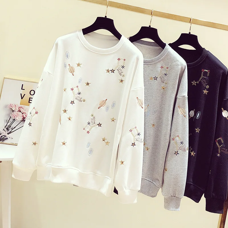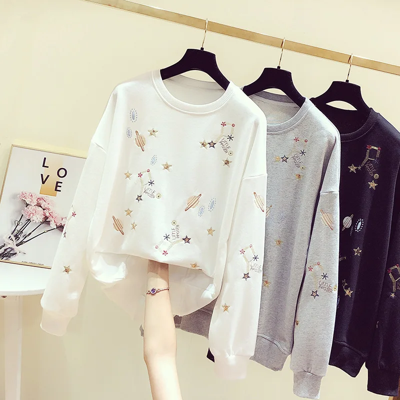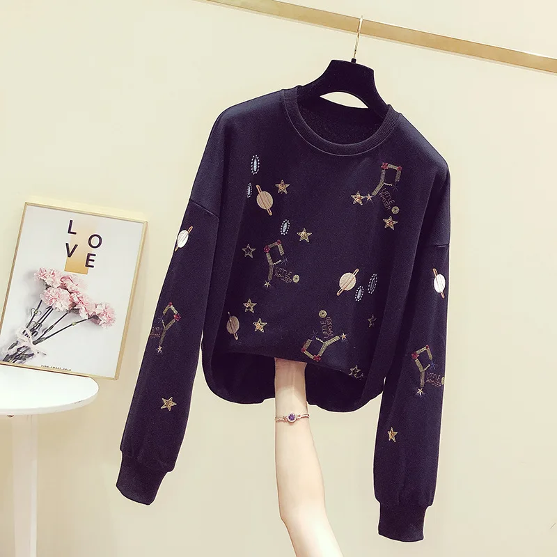 Осень-зима 2020, Женский пуловер с круглым вырезом и вышивкой звезд, удобный и универсальный Повседневный свободный Женский свитшот