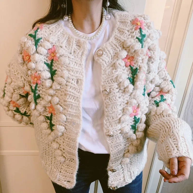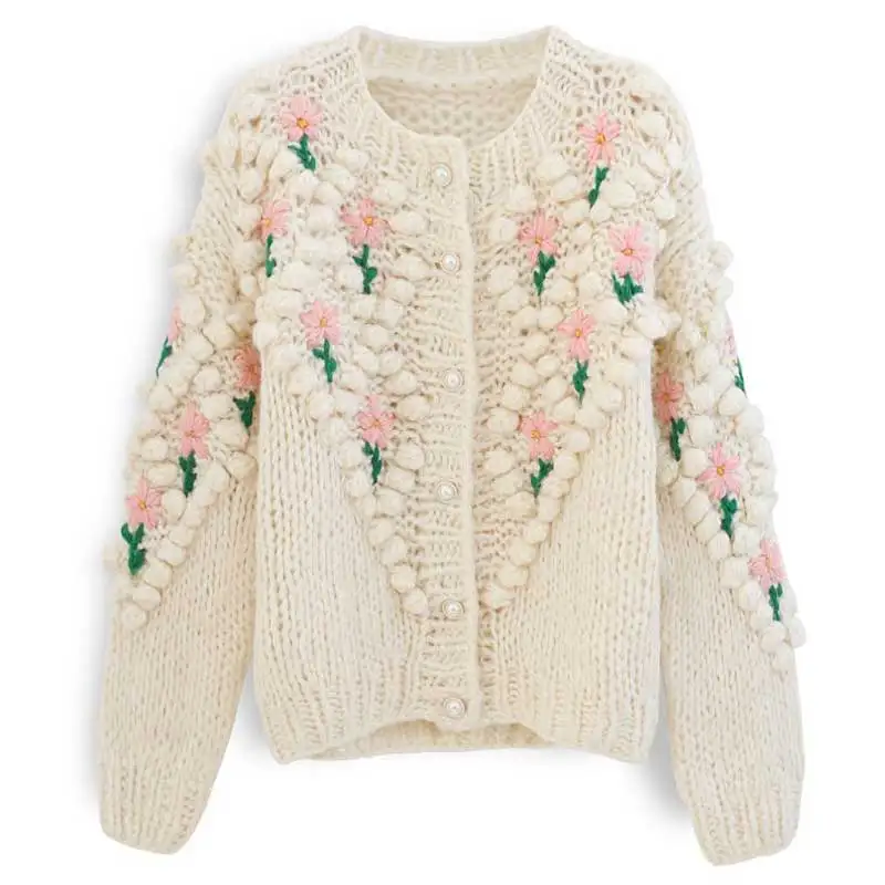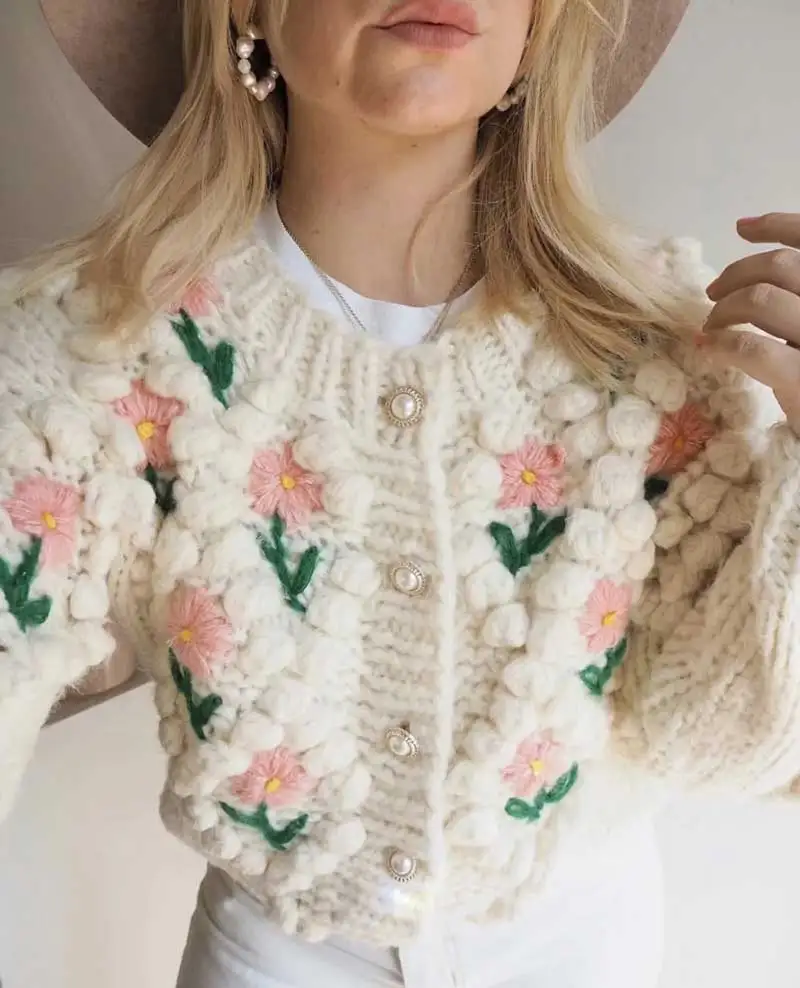 Женский трикотажный кардиган с цветочной аппликацией и длинными рукавами