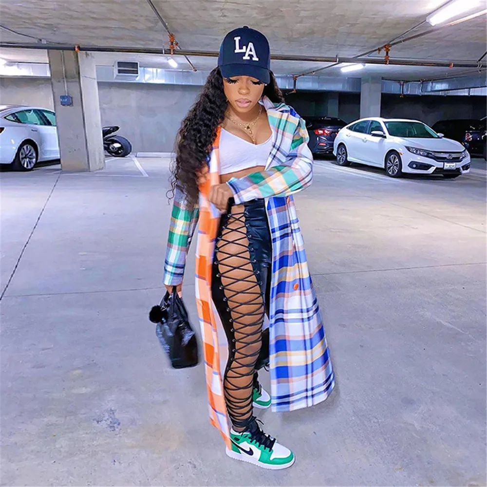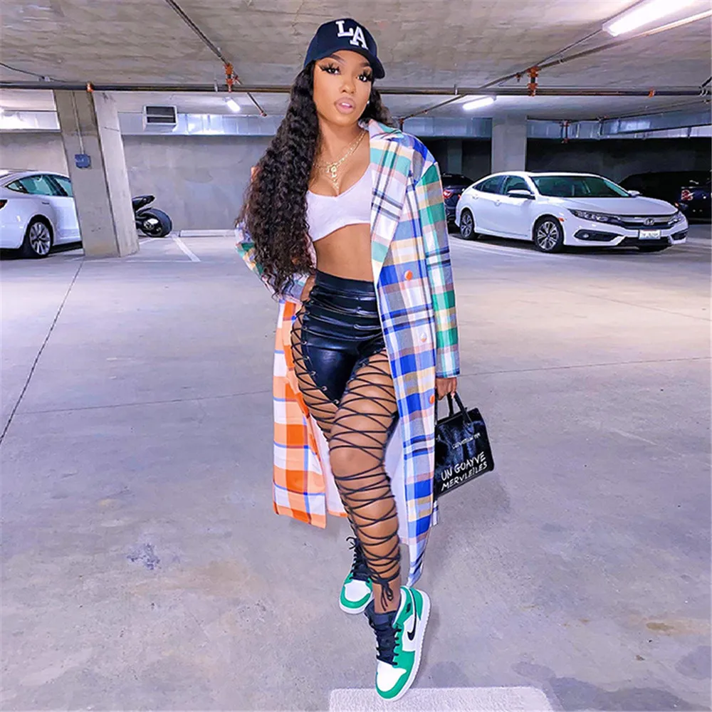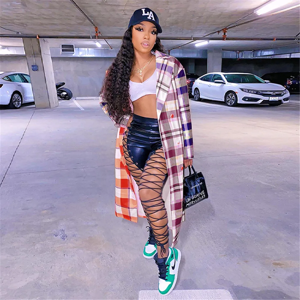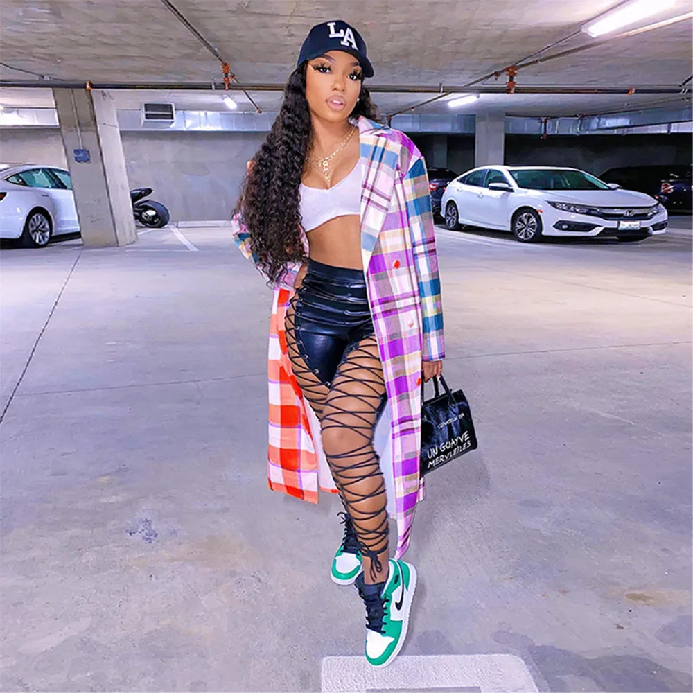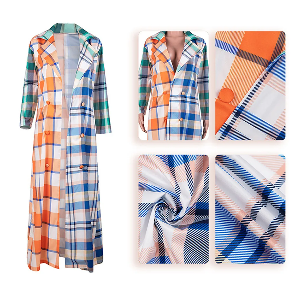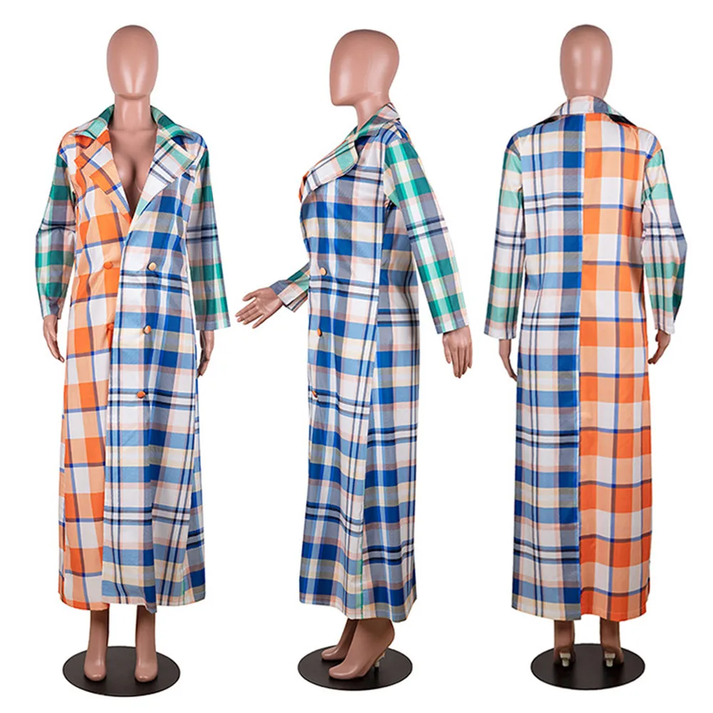 Цветная Длинная зимняя куртка в клетку и пальто для женщин, двубортная верхняя одежда с длинными рукавами, уличная одежда, повседневный шикарный топ, Femme Veste