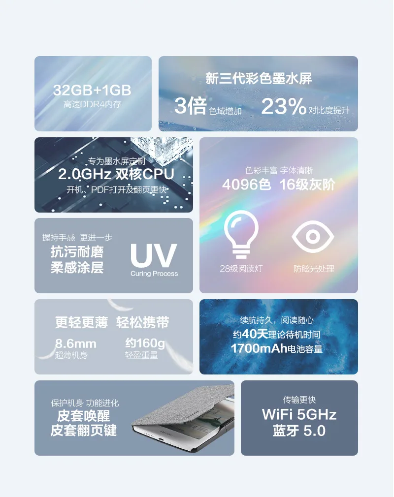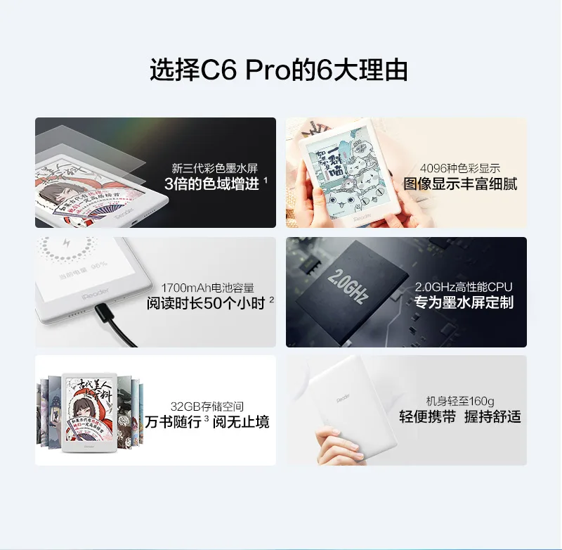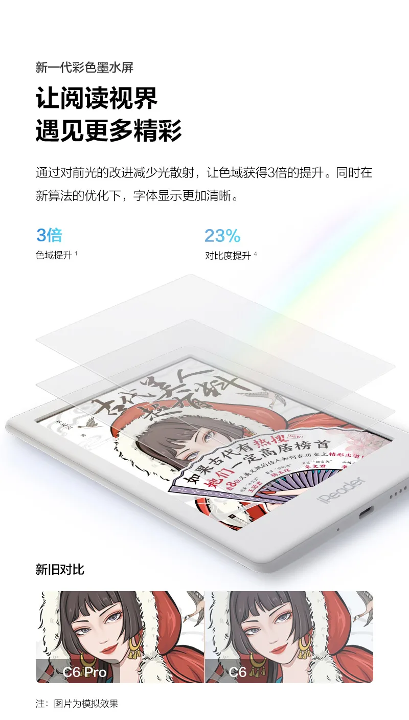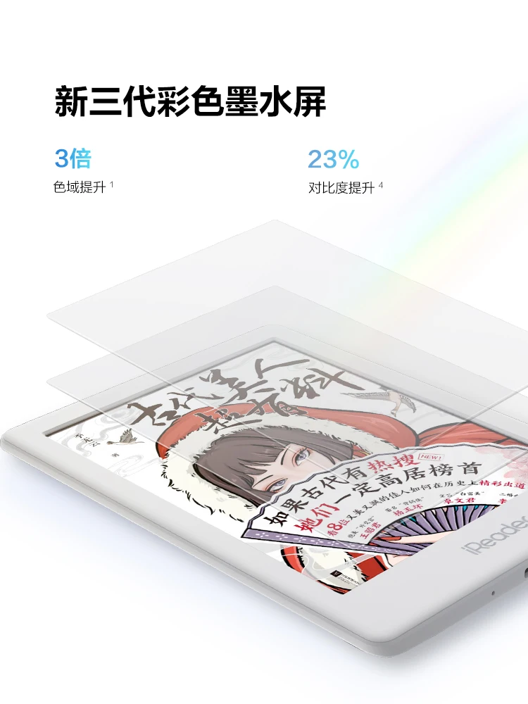 IReader C6 Pro использует новейшую технологию отображения цветных электронных чернил третьего поколения с трехкратным увеличением цветовых гамбит и увеличением контрастности на 28%. Он может отображать 4096 цветов, лучше восстанавливая цветовой мир и предоставляя вам лучший опыт чтения!