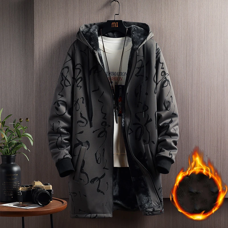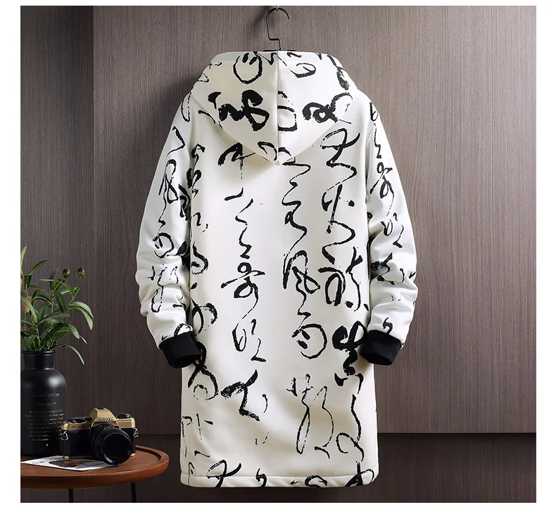 Мужская свободная ветровка с бархатным капюшоном, модное пальто с принтом, повседневное длинное пальто