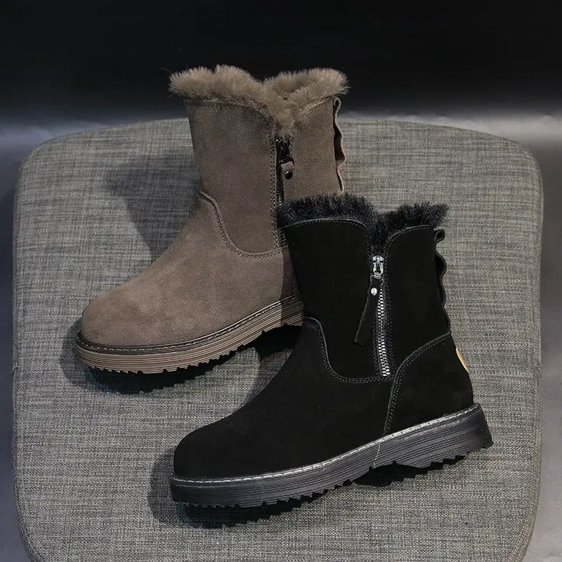 Ботинки женские кожаные, на плоской подошве, с плюшевой подкладкой, теплые, черные