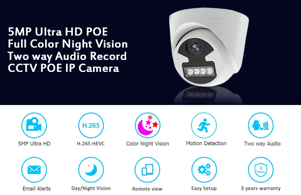 1, Ультра HD 5 Мп дисплей высокой четкости, расширенное H.265 Сжатие видео;2. Ультра HD 5MP POE ip-камера, АБС-пластик, подходит для внутреннего и наружного использования, надежная Домашняя безопасность;3. Поддержка питания через Ethernet, подключи и работай, простота установки;4. Поддержка аудиозаписи, все камеры встроены в микрофон;5. Поддержка ночного видения Ultra HD;6. Поддержка IR-CUT переключателя двойного фильтра, днем и ночью для достижения мониторинга, цвет не является частичным искажением цвета;7. Поддержка обнаружения движения, оповещения по электронной почте и многоязычные;8. Поддержка Android,Iphone,Ipad,PC,VMS,P2P view;9, удаленный доступ в любом месте, в любое время;10, подходит для всех видов мест применения;