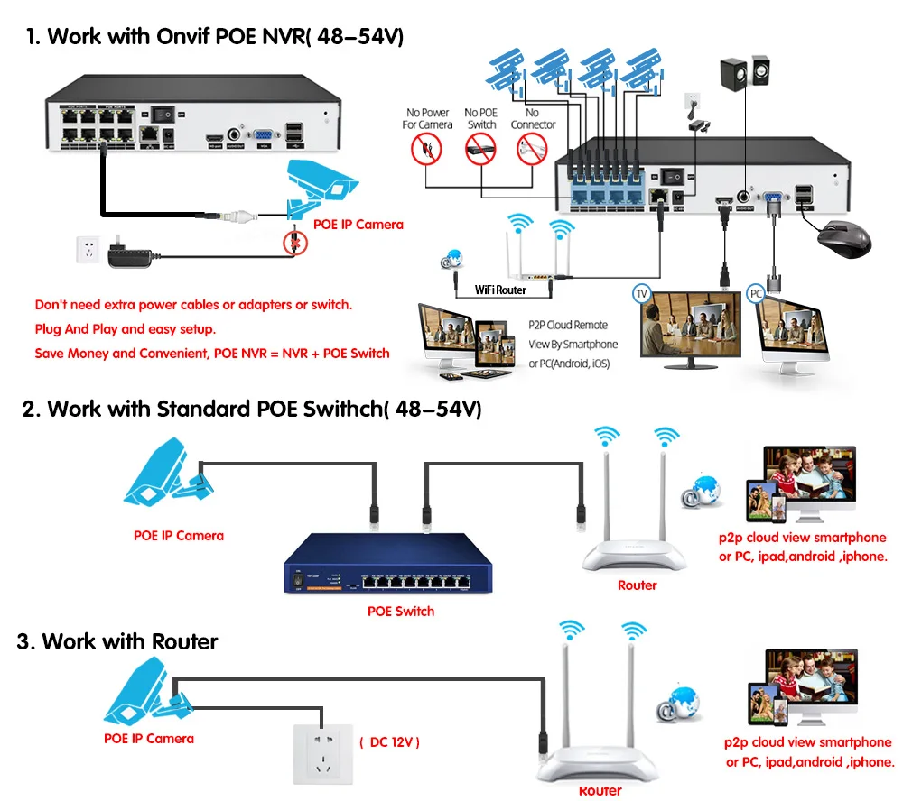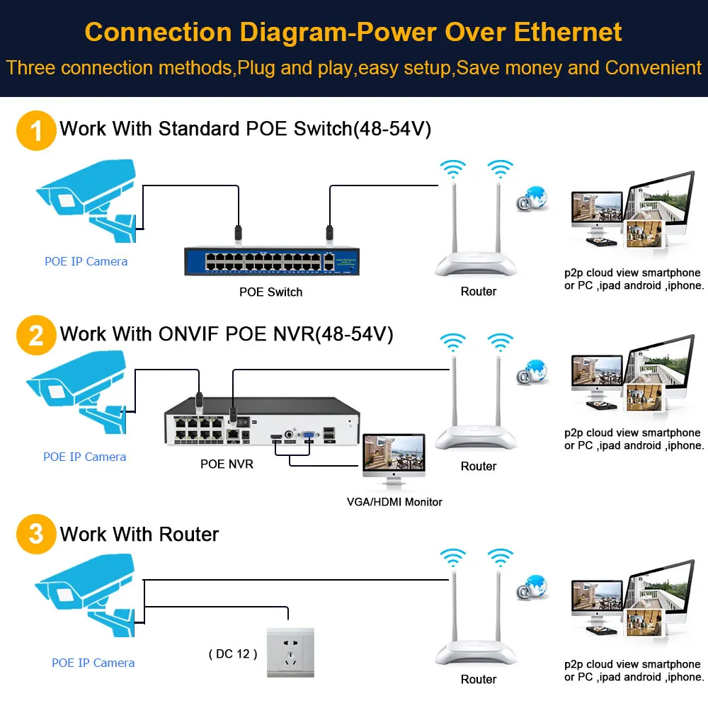 Нет дополнительных кабелей питания или адаптеров, просто подключив ip-камеру к NVR с помощью одного кабеля, вы можете легко завершить установку без знания о компьютере или сети и начать наслаждаться супер простым мониторингом среди вашего смартфона, планшета или ПК.Экономьте деньги и удобный POE NVR = NVR + POE коммутатор, подключи и работай и простая настройка!
