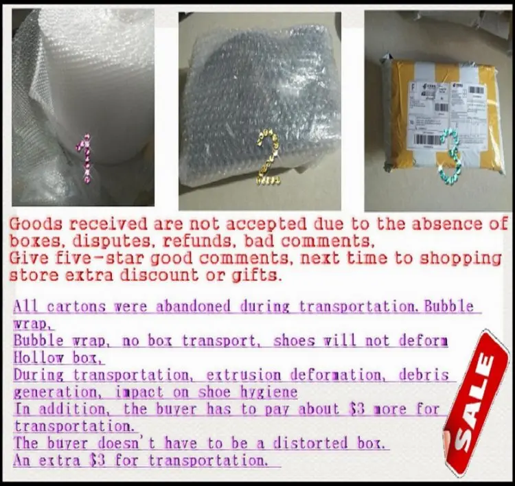 Обычно мы отправляем ботинки с логотипом, если вам не нужен логотип, пожалуйста, добавьте Примечание/Примечание при размещении заказа или отправьте мне сообщение после размещения заказа. Мы отправляем ботинки без коробки, потому что коробка тяжелая, вам придется заплатить больше за доставку Стоимость и трудно выпустить с таможни. Мы упаковываем в пузырчатый пакет. Товар будет в хорошем состоянии после получения. Иногда могут слегка погнуться, но вскоре после того, как вы достали посылка и надели Их.