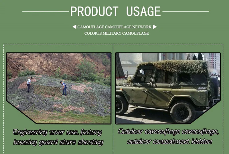-100% новые и высококачественные. -Камуфляжная камуфляжная сетка джунглей без веревки. -Камуфляж очень эффективный, реалистичный и универсальный. Основная роль и цели: -Камуфляжная армейская подготовка, военные установки анти-Инфракрасный радар. -Компания по недвижимости, не работающая на холостом ходу, аэрофотосъемка. -Незаконные здания и растительная анти-спутниковая фотография. -Автостоянки и другие общественные места для ландшафтного дизайна. -Горные и зеленые покрытия, покрывают мусор. -Для любителей наблюдения за птицами нужно снимать на расстоянии и в контакте с птицами камуфляжной расцветки. -Wargame Снайпер камуфляж и использование. -Декоративное озеленение (тематические парки, выставки, кинобаза, развитие на открытом воздухе, моделирование поля CS, украшение отеля, промышленное украшение, украшение дома и т. д.), цвет фона имитации и другие аспекты.
