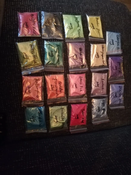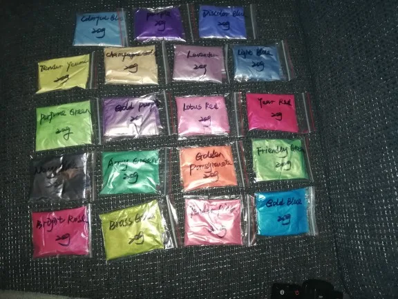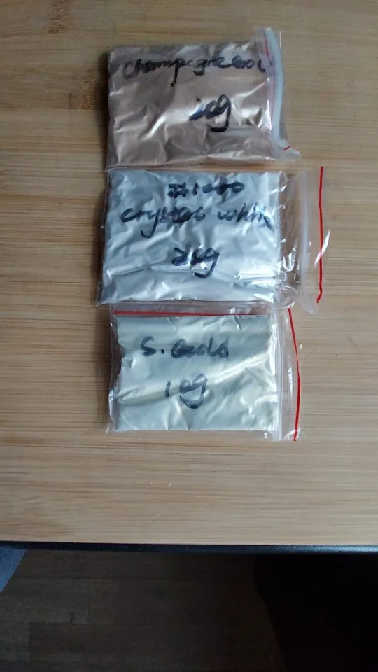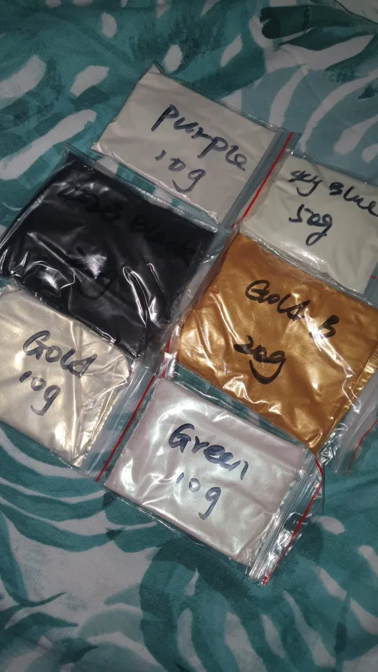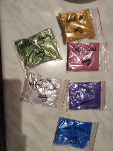 Красиво! Это очень тонкая пудра и блестящий свет. Цвета соответствуют их названиям. Доставка занимает всего 2-3 недели! Я купил его, чтобы смешать с прозрачным глянцевым покрытием, чтобы положить на мои глиняные горшки. Еще не пробовал, но это план!