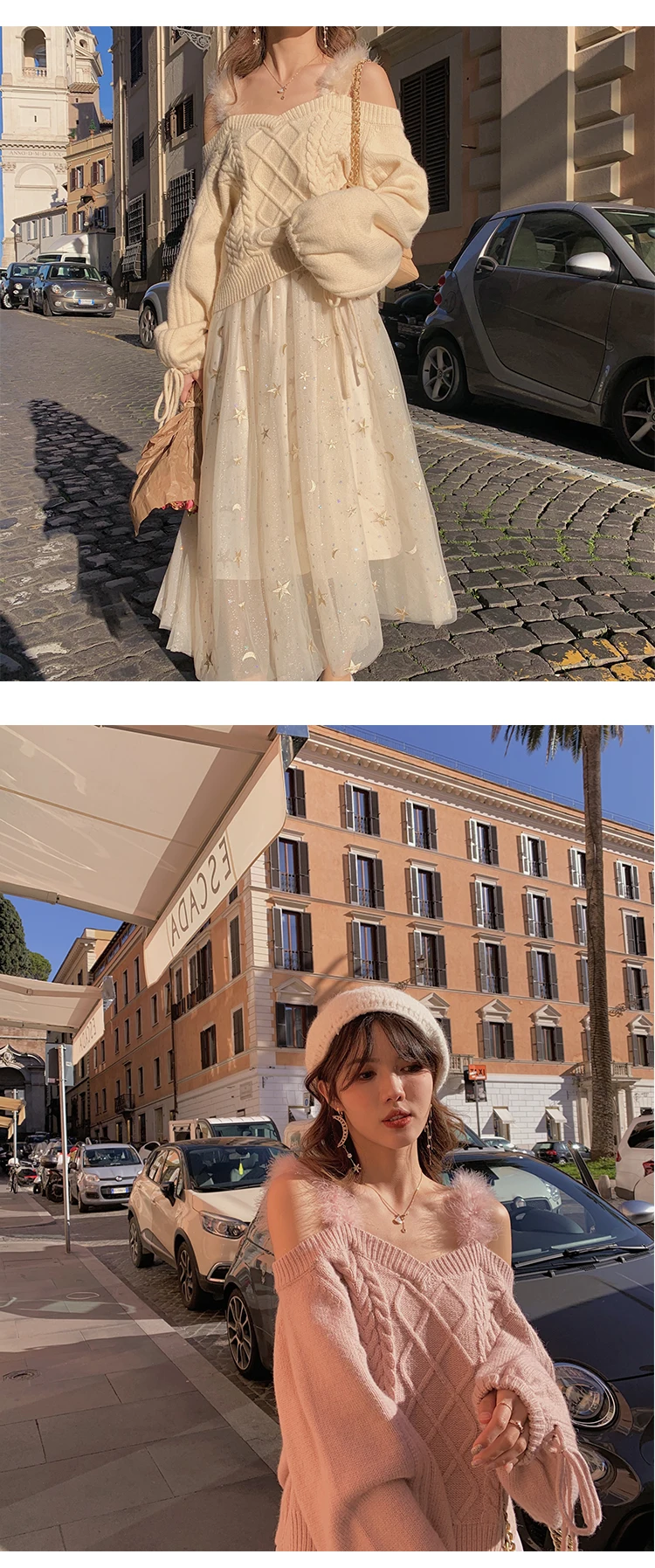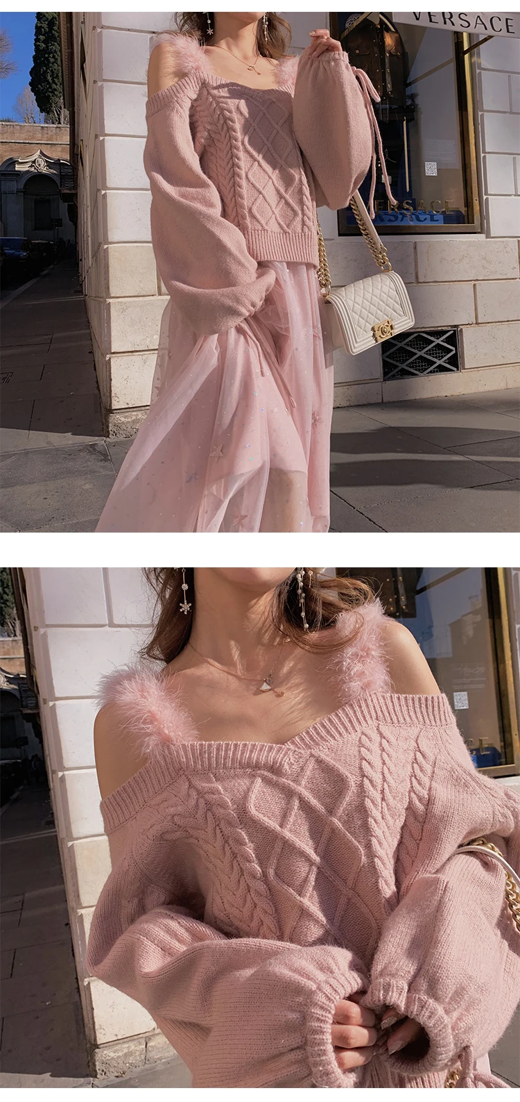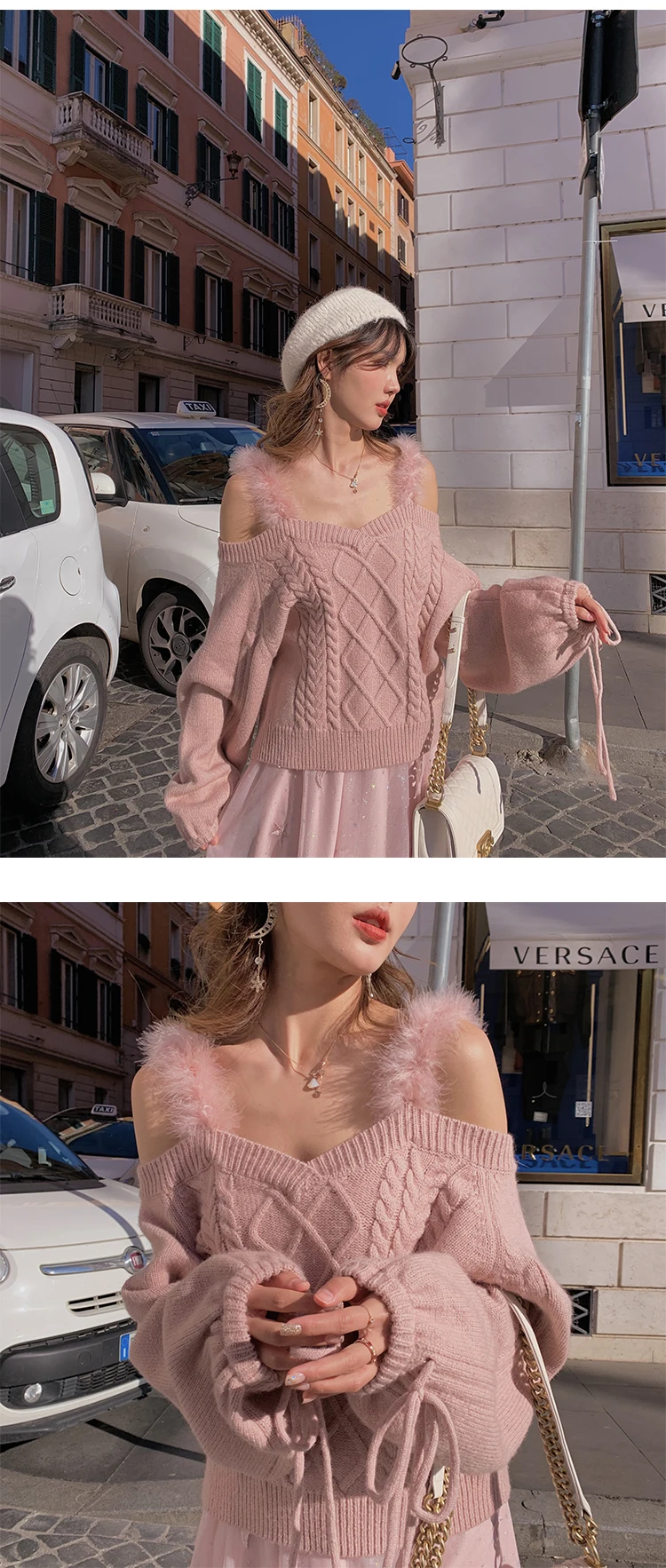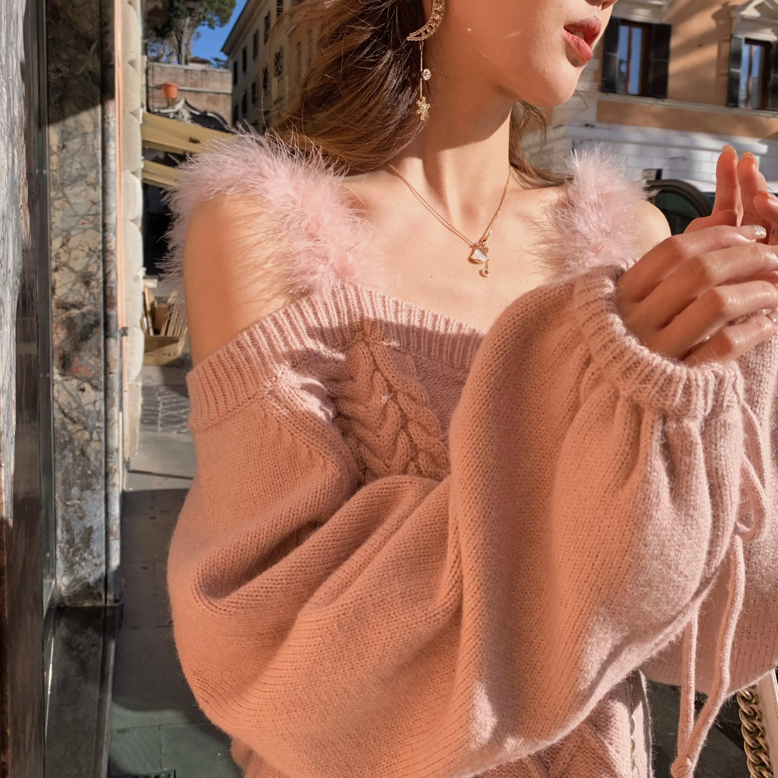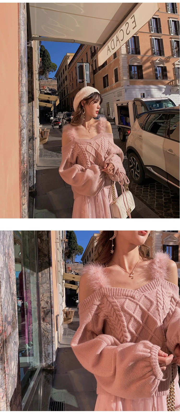 Милый свитер с открытыми плечами, Женский пуловер, сезон осень-зима, вязаные свитеры на завязках с пышными рукавами, пушистые свитеры на тонких лямках, MY2090