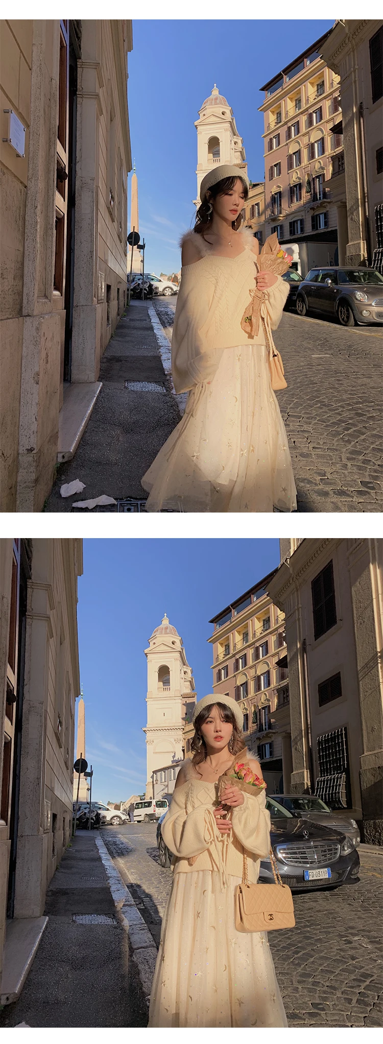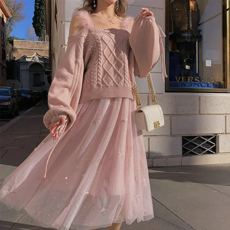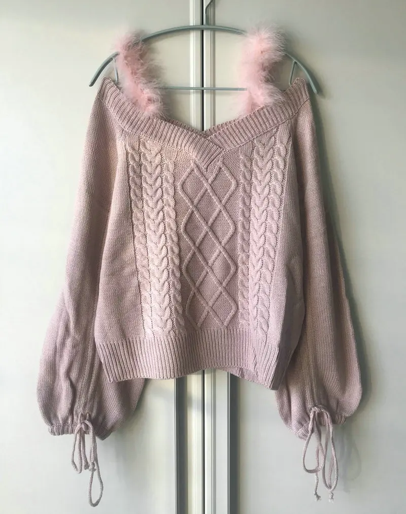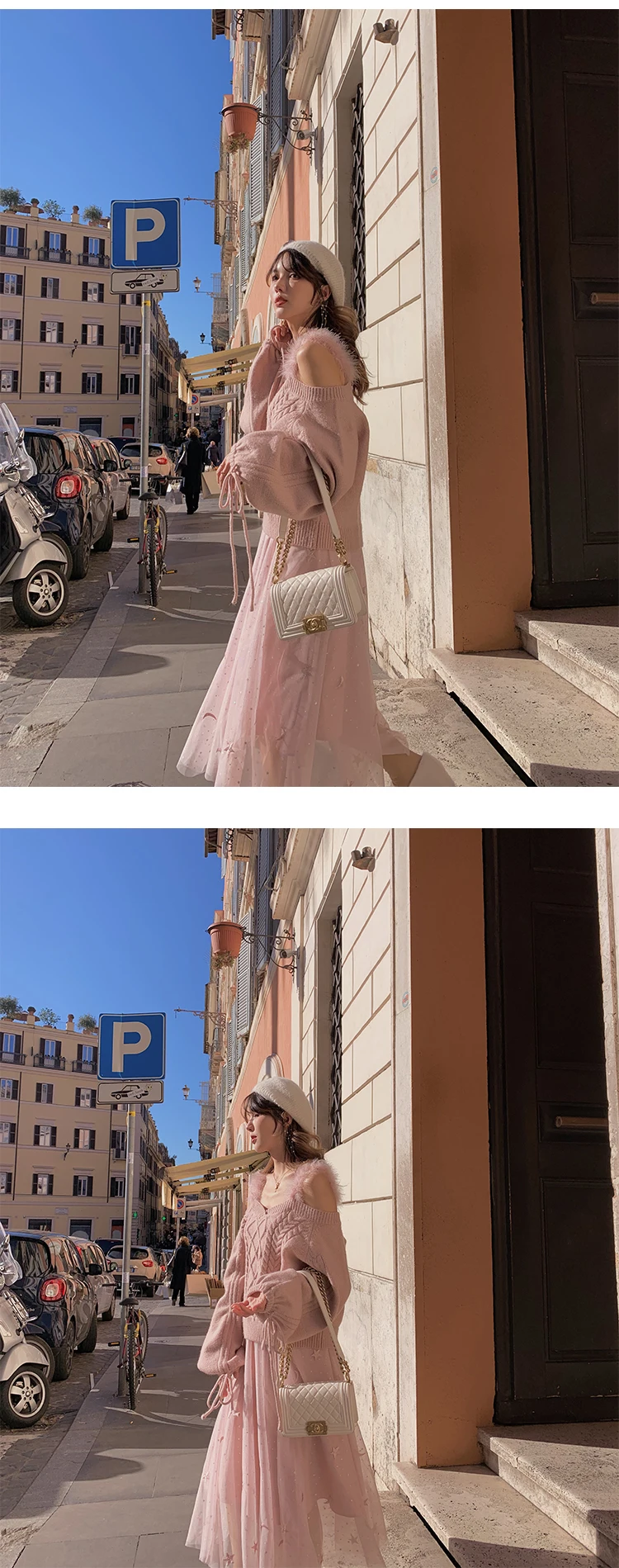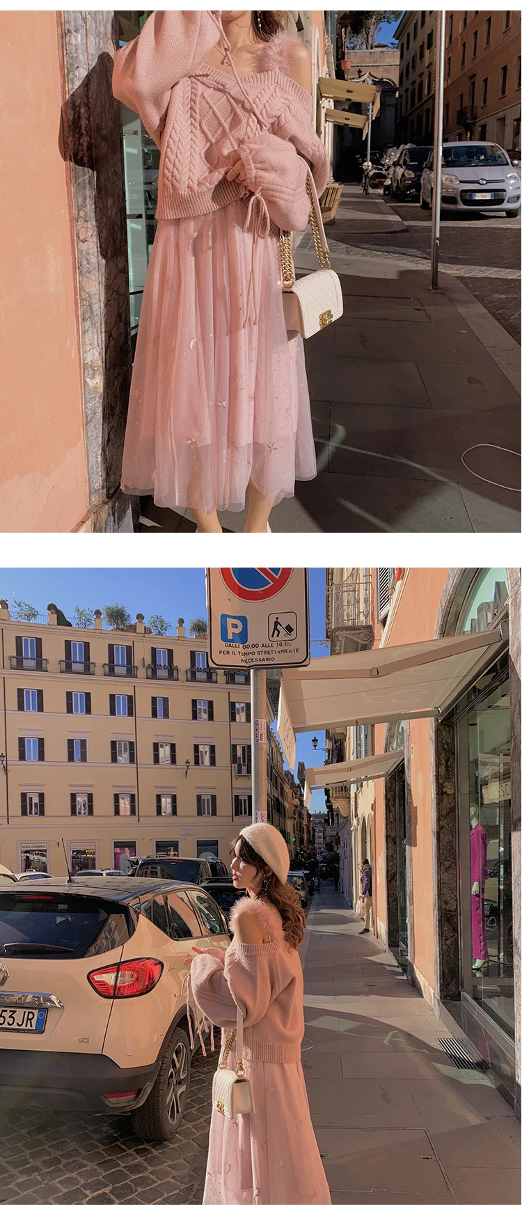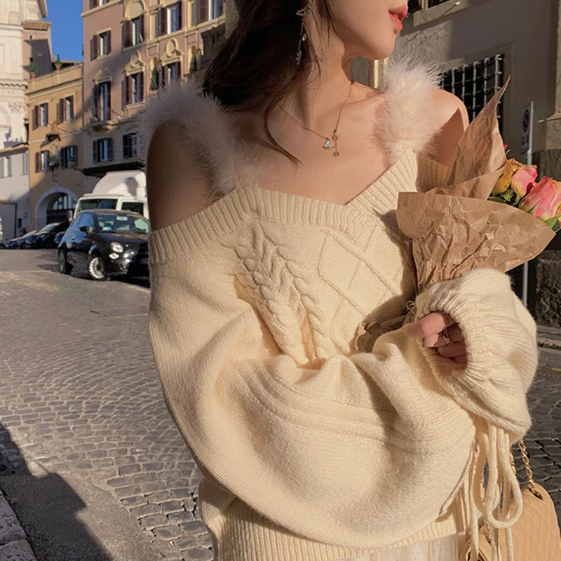 Милый свитер с открытыми плечами, Женский пуловер, сезон осень-зима, вязаные свитеры на завязках с пышными рукавами, пушистые свитеры на тонких лямках, MY2090