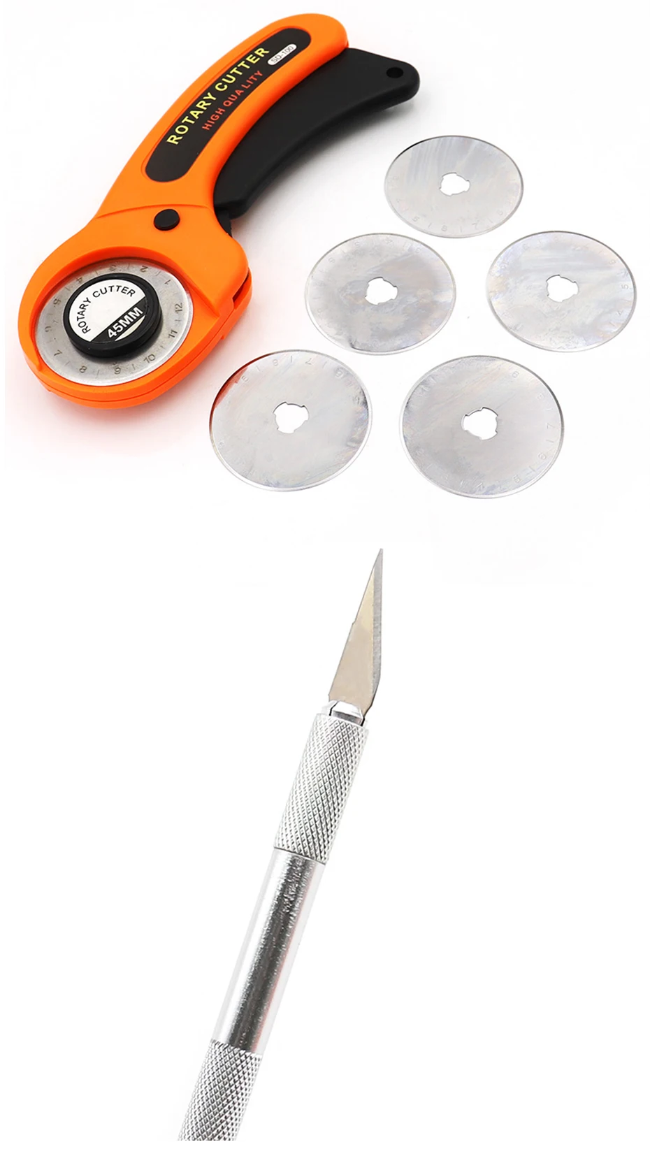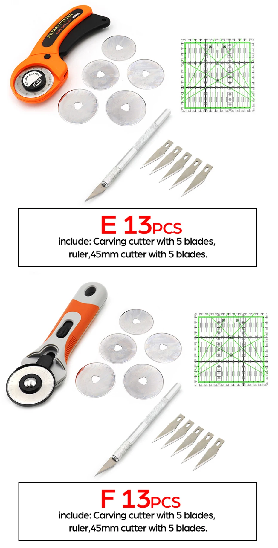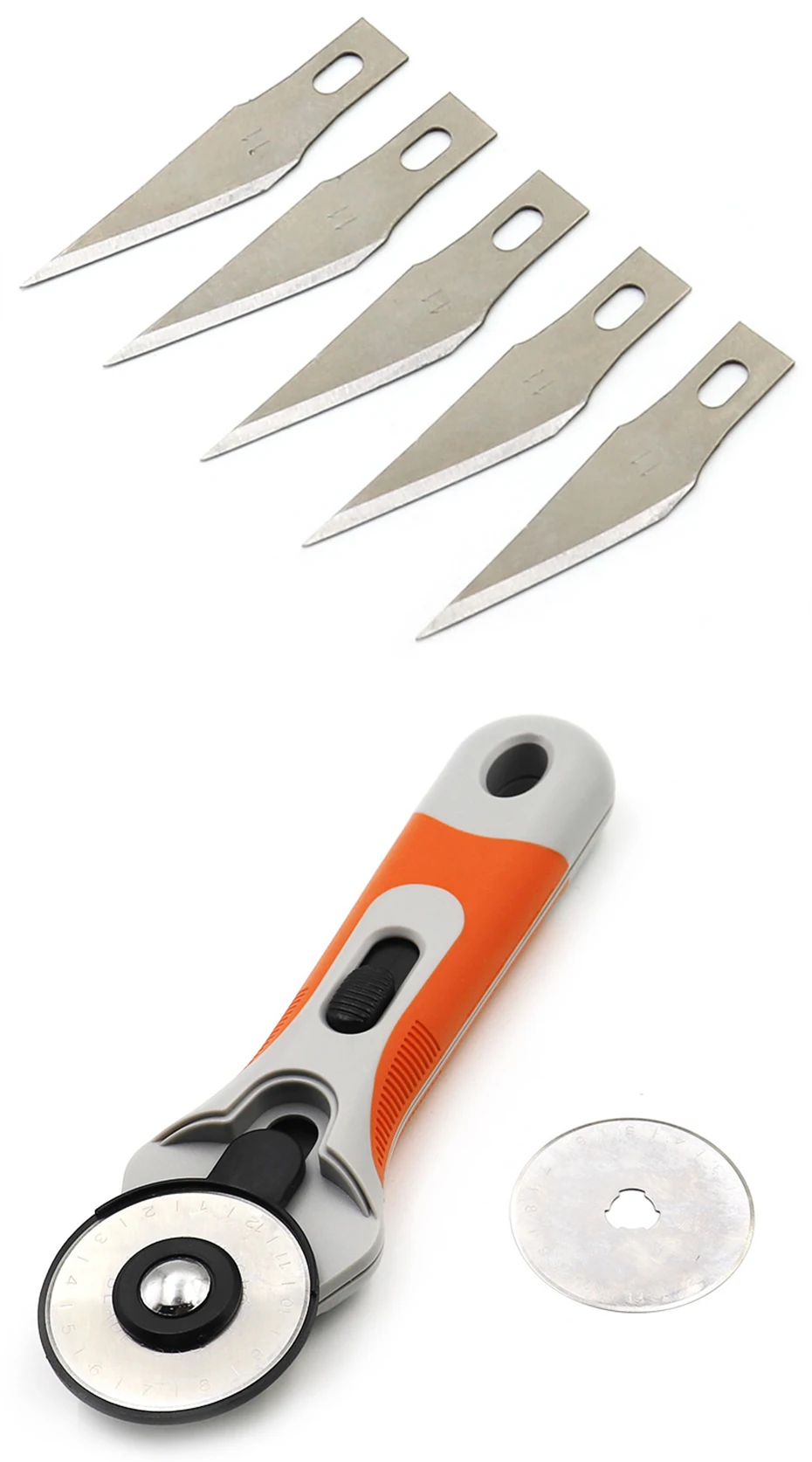 Этот комплект удовлетворит все ваши потребности. Содержит 1 шт. 45 мм оранжевый тканевый резак с 5 лезвиями, 1 шт. A4 разделочная доска, 1 шт. 15*15 см двухцветная квадратная Лоскутная линейка, 1 шт. резец с 5 лезвиями.Оснащен сумкой для хранения, так что вы можете хранить швейный инструмент 5 в 1 вместе и носить его в любом месте.Точная резка; Легко проходит через несколько слоев ткани, карт и бумаги. Эргономичный дизайн ручки делает резец легче держать и равномерно резать.