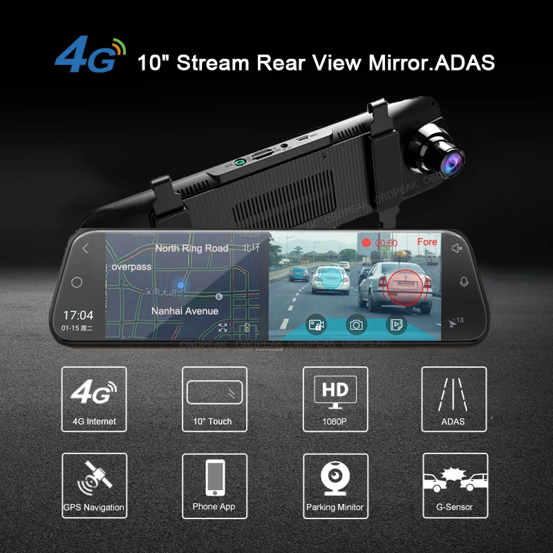Автомобильный видеорегистратор OBDPEAK, 10 "HD дисплей, 4G, Android 8,1, 1080P, WIFI, ADAS, GPS-навигация