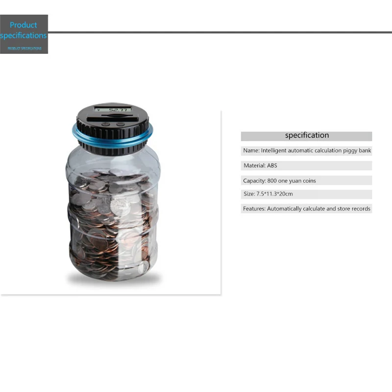 Эта прозрачная банка оснащена ЖК-экраном на крышке, питанием от батареек 2 * AAA 1,5 В (не входят в комплект), помогает считать ваши монеты, когда они проскальзывают через слот. Он точно подсчитывает ваши деньги и отображает общую сумму для каждого депозита.