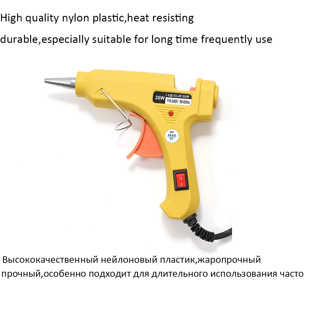 Советы:1. Чтобы предотвратить обжигание, пожалуйста, не прикасайтесь к раствору клея, который выходит из пистолета.2. Для того, чтобы сделать вашу работу плавно, пожалуйста, предварительно Нагрейте клеевой пистолет в течение 3-5 минут (время разогрева) перед использованием.Примечание: клей не может быть снят после использования.Преимущества:1. Клей: Подходит 7 мм2. Наш клеевой пистолет не протекает, мы выбираем Лучший Качественный Клеевой пистолет для наших клиентов.Характеристики:О термоплавком клеевом пистолете:Материал: пластик и алюминийРабочая мощность: 20 ВтРабочее напряжение: от 100 до 240 ВРабочая температура: 180 ℃Время разогрева: 3-5 минутО клеевых палочках:Цвет: прозрачныйПосылка: простая упаковкаВремя лечения: 10-20S Посылка включает:Посылка включает в себя: 1 x клеевой пистолет; 2 x клеевые палочки