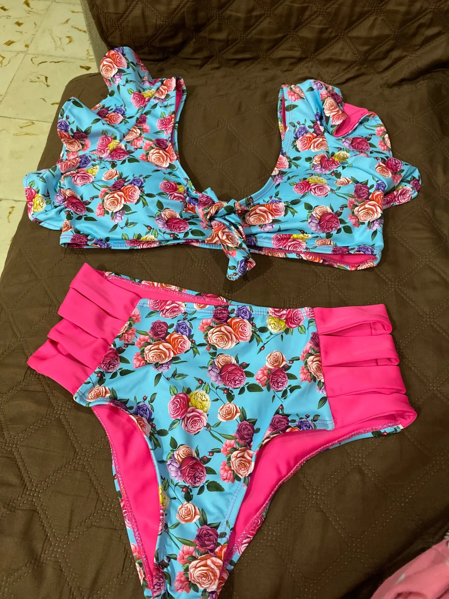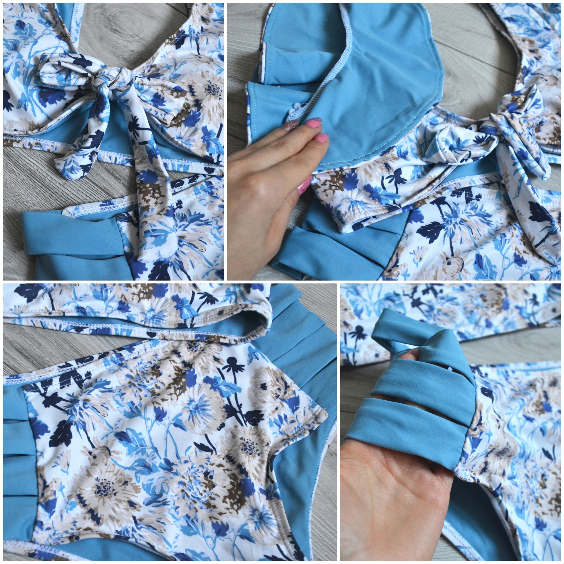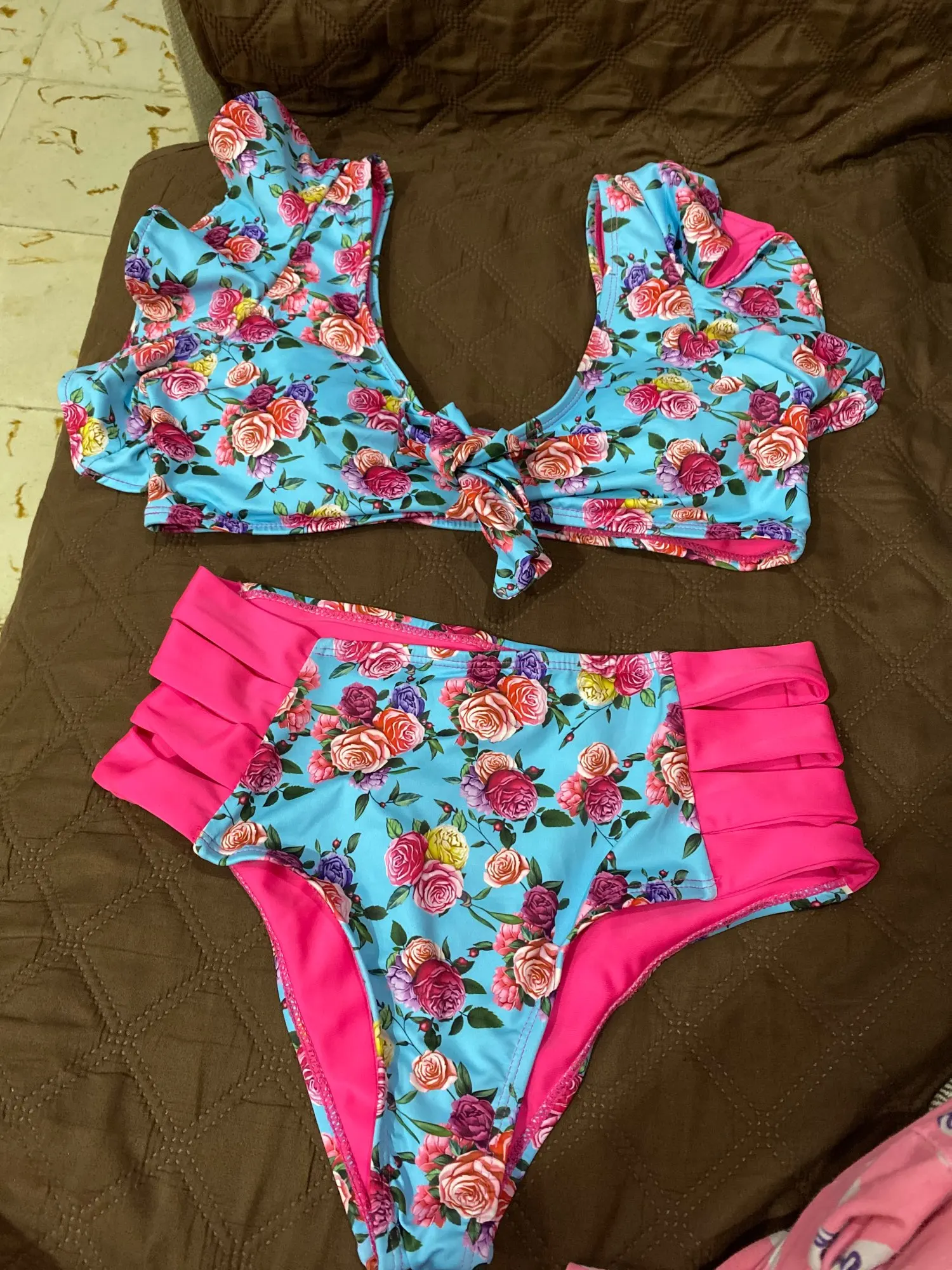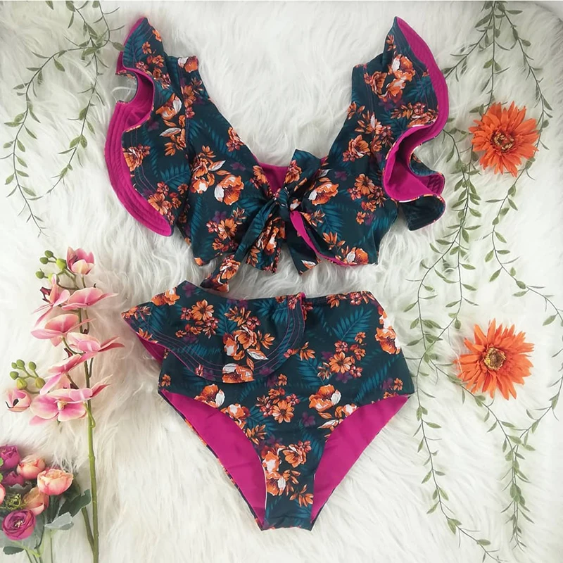 Женский цветочный комплект бикини, купальник из двух предметов с треугольным вырезом и высокой талией, пляжный купальный костюм для девочек, бикини, 2020
