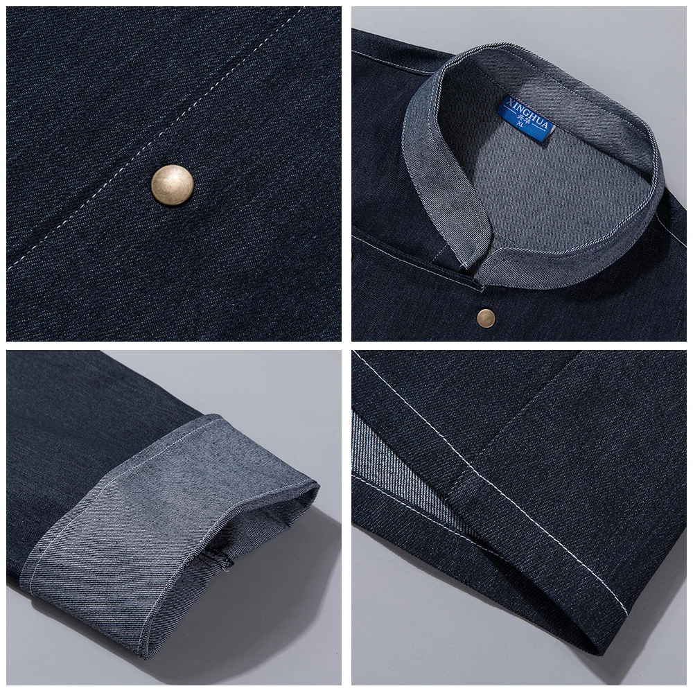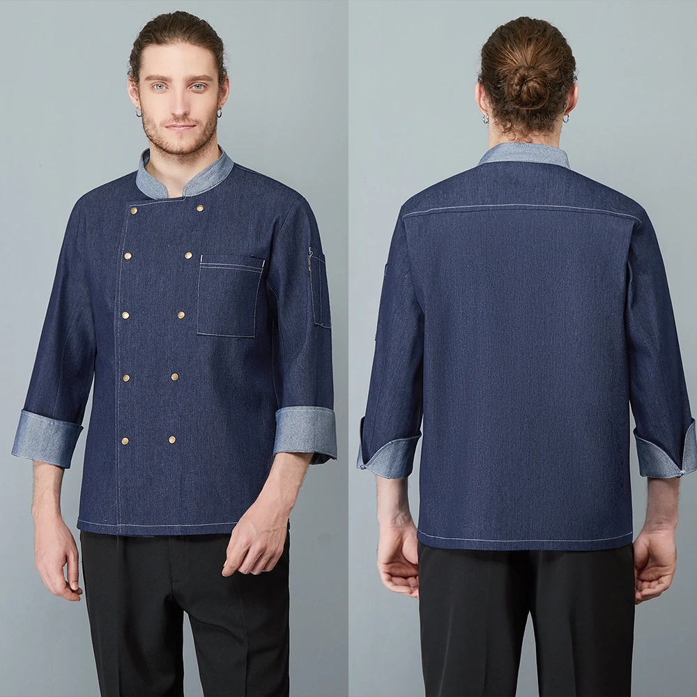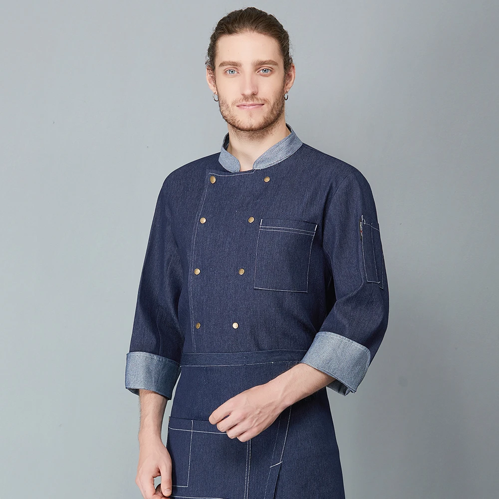 Новая джинсовая двубортная форма шеф-повара с длинными рукавами, высококачественные комбинезоны унисекс, фартук, шляпа, ресторан, отель, официант кафе, пальто
