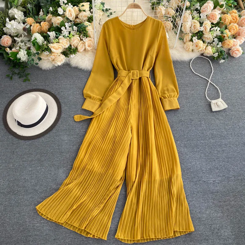 Наименование товара : Женский весенне-осенний комбинезон, Новые однотонные плиссированные широкие брюки с круглым вырезом и длинными рукавами, тонкий комбинезон на шнуровке LL061