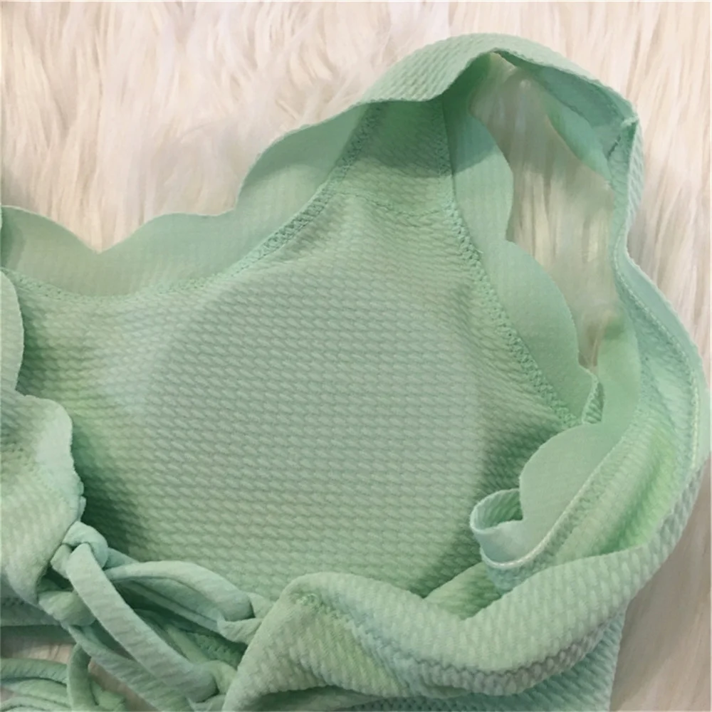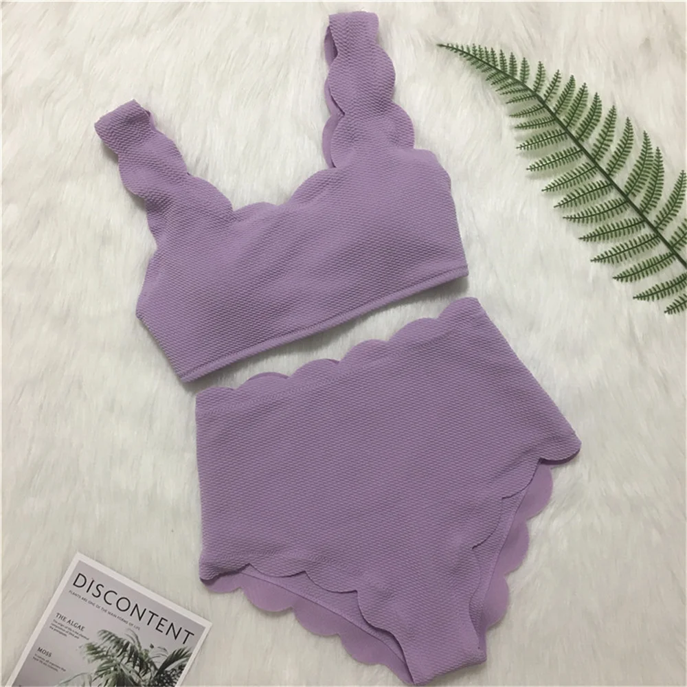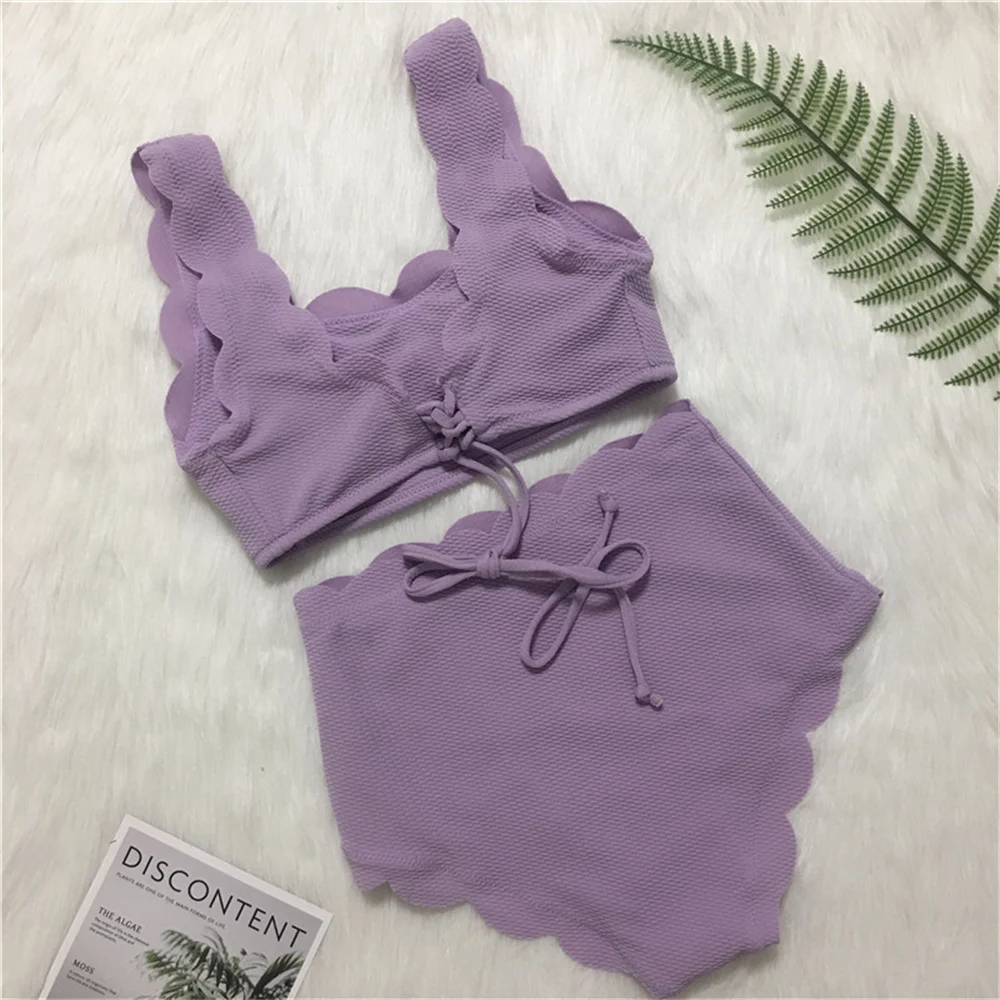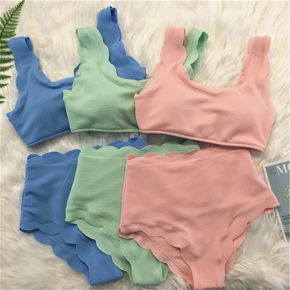 Женский однотонный купальник, женский купальный костюм, комплект бикини с фестонами и высокой талией, бикини из двух предметов, танкини