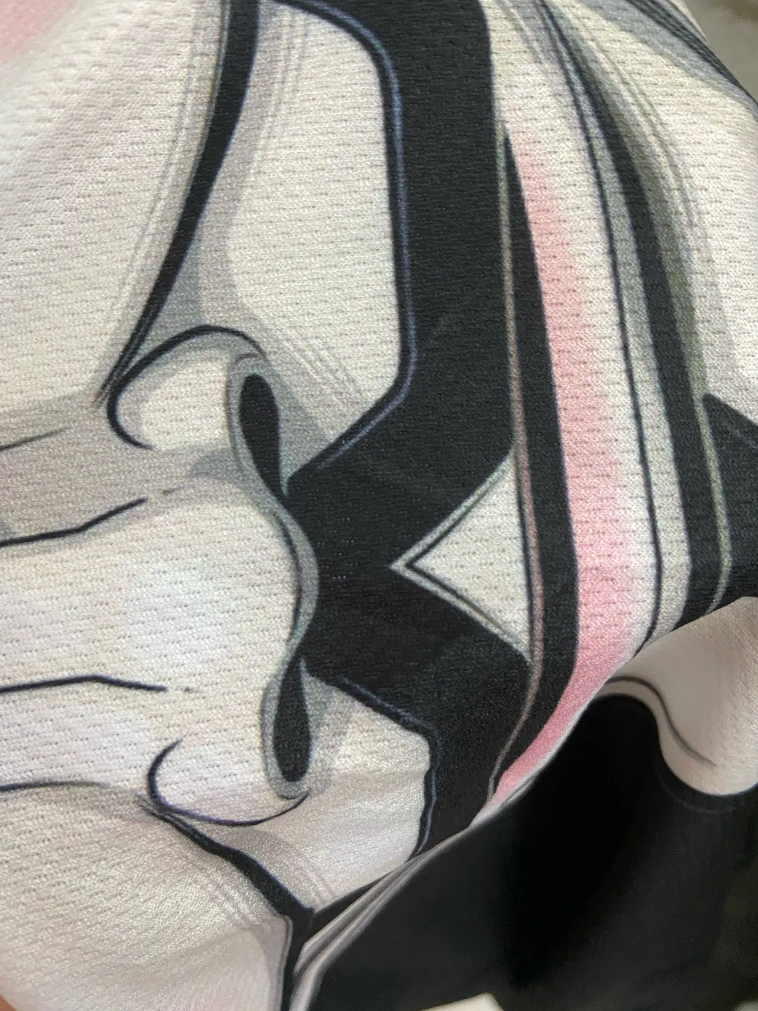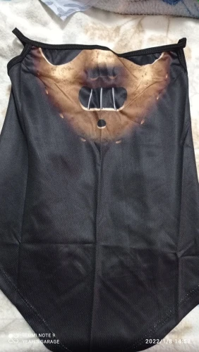 Great print-out. Bandana has ear loops to keep it on. Satisfied. Thanks to seller.