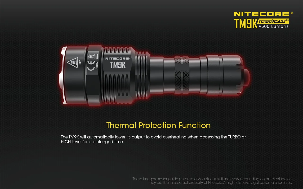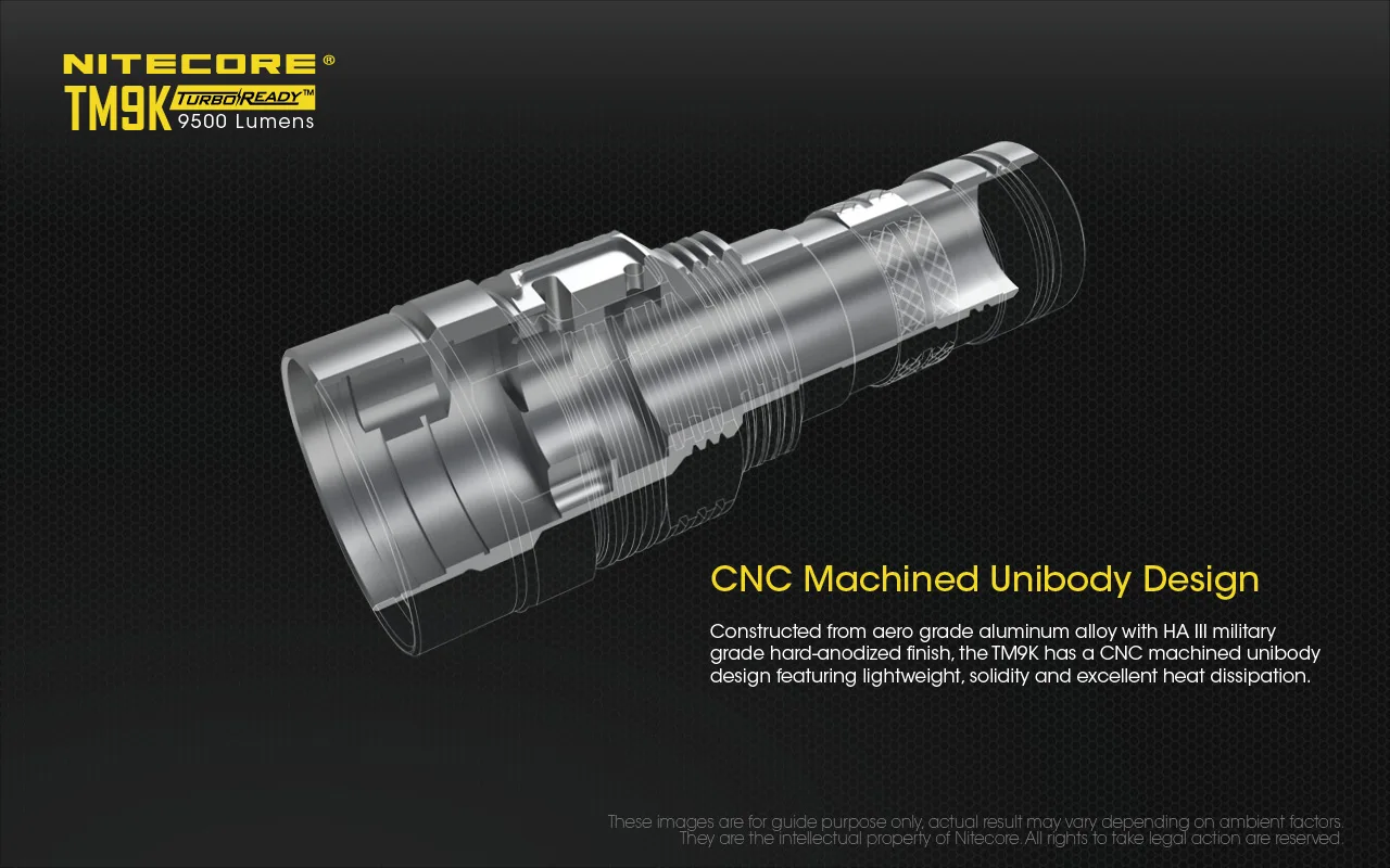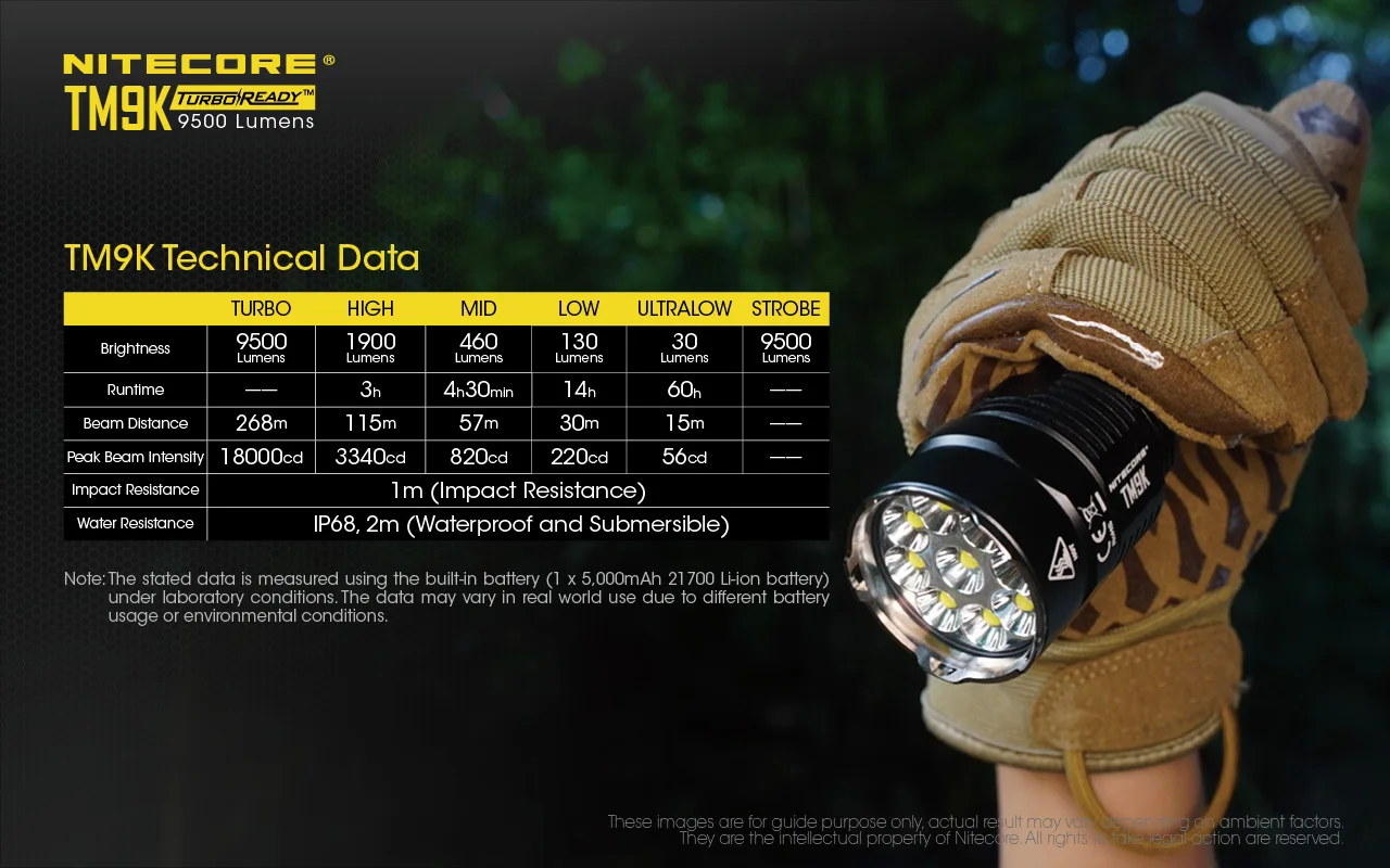 Nitecore TM9K представляет собой мощный перезаряжаемый светодиодный фонарь с 9 CREE XP-L HD V6 светодиодный массивами. Вместе со встроенным литиево-ионным аккумулятором 5000 мА · ч эта лампа может достигать удивительного турбо-режима 9500 люмен! TM9K имеет интуитивно понятный двойной задний переключатель, который позволяет пользователям получить доступ к мгновенному турбо через кнопку режима TurboReady, позволяя им принимать немедленные действия, когда они нуждаются в нем больше всего. Мощный режим вспышки также может быть доступен немедленно для несмертоносной, но очень эффективной самозащиты. Кроме того, прочная ударная перегородка из нержавеющей стали перед лампой используется для разбивания стекла или боевых действий.