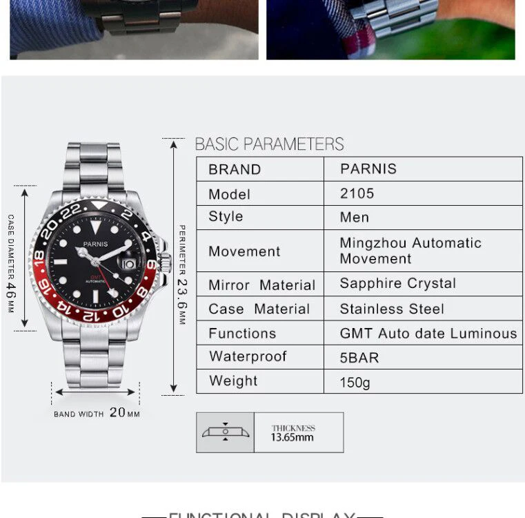 Мужские наручные часы, мужские автоматические часы PARNIS GMT Роско...