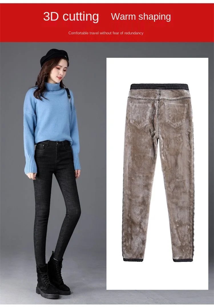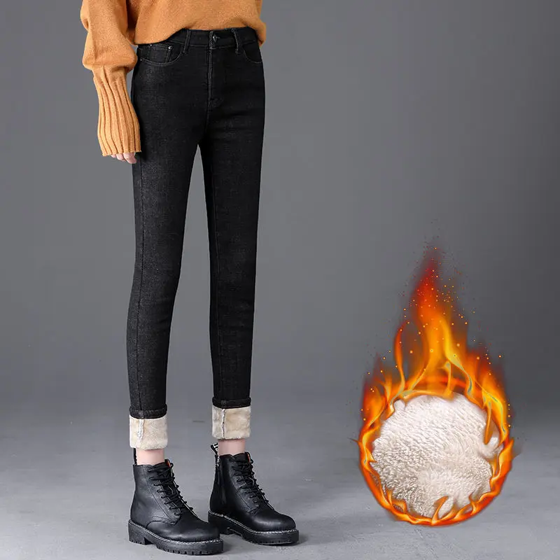 Флисовые джинсы, Женская Корейская версия эластичных облегающих брюк, длинные брюки, зимние джинсы для мам, брюки-бойфренды