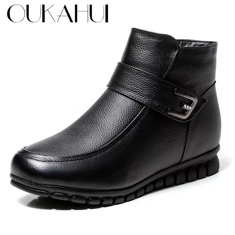 Женские ботильоны из натуральной кожи OUKAHUI, черные ботинки из натуральной кожи на низком каблуке, с металлической пряжкой, на меху, на зиму, 2020